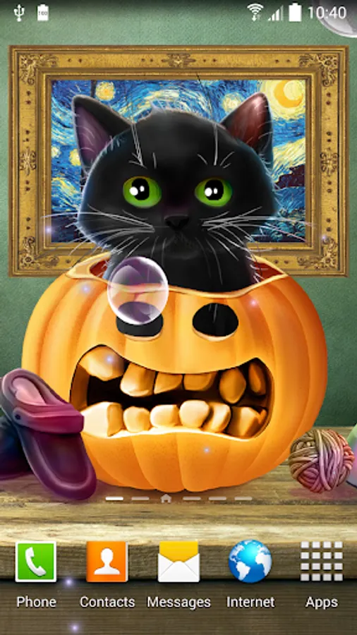 How to set Kitten on Halloween Live Wallpaper on the screen of your phone: Home → Applications → Settings → Display → Wallpapers → Home screen wallpaper → Live wallpapers → Halloween Kitten Live Wallpaper