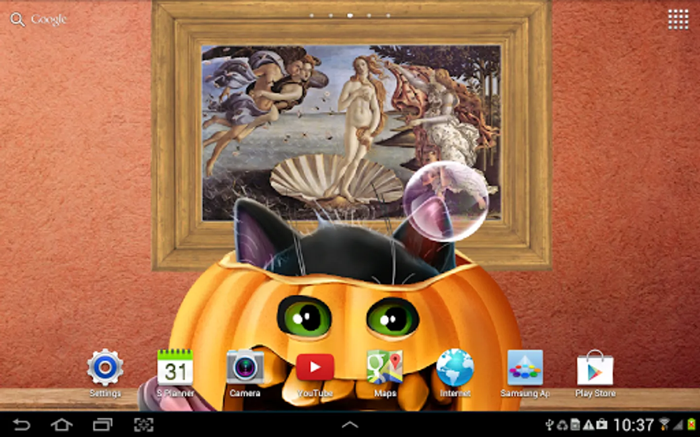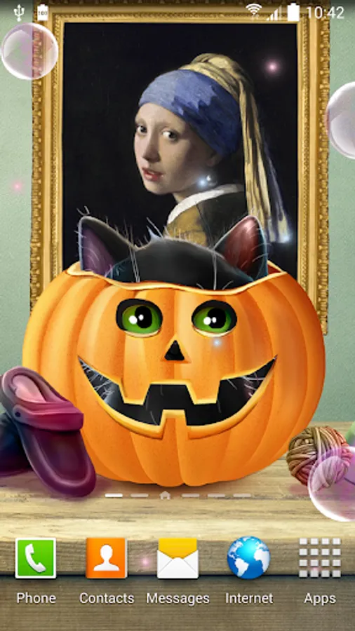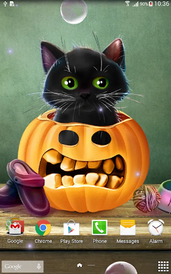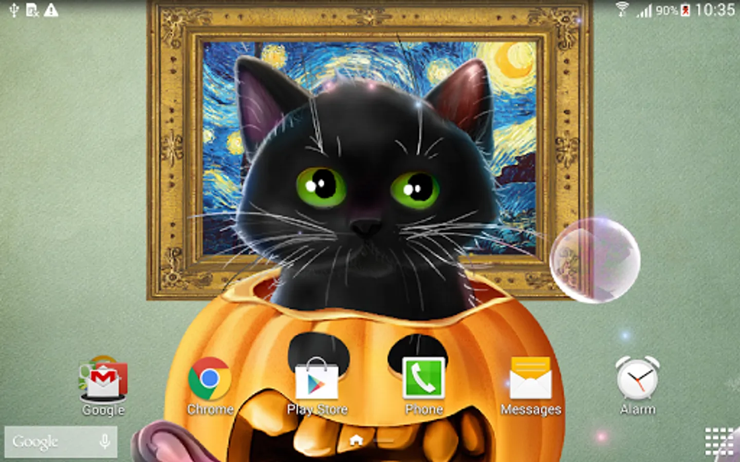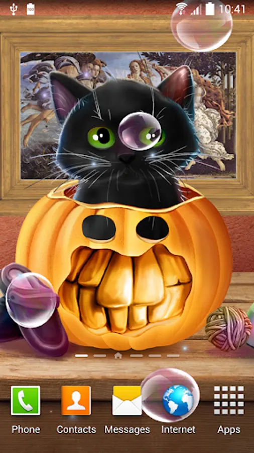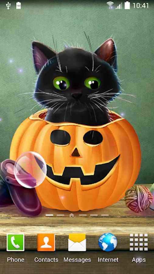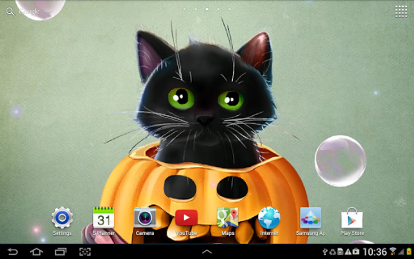 Animated Live Wallpaper "Cute Halloween Live Wallpaper" for Android will be a great decoration of your smartphone or tablet. The application is fully interactive: Kitten watching finger and hides on touch, and soap bubbles can be burst by finger. A lot of settings and effects will help make your device special.