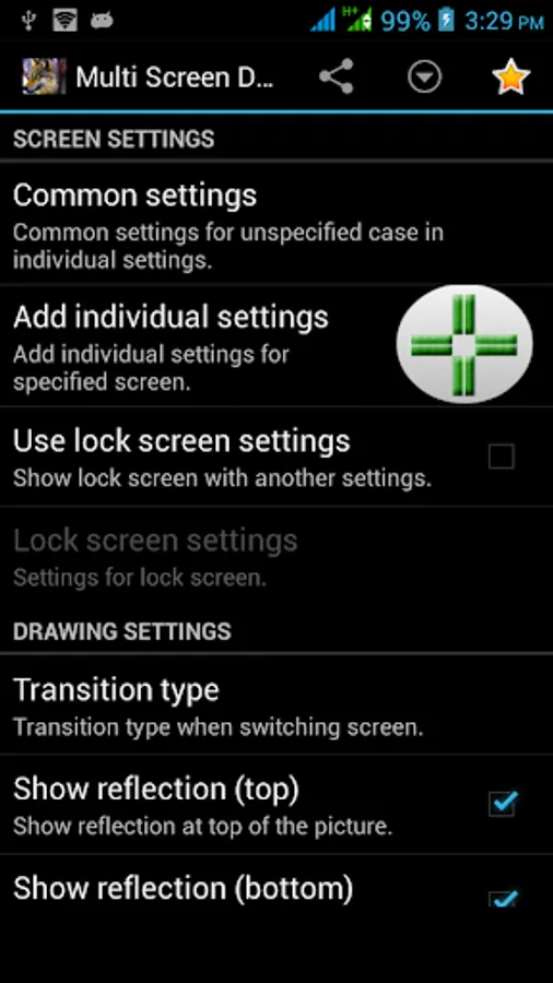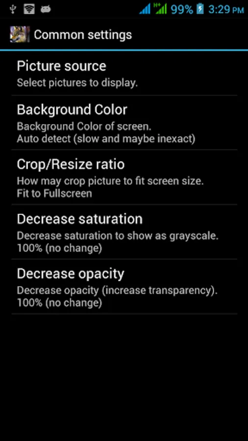 Common settings: - Select picture source to display pictures (picture source can be internal wallpaper present in live wallpapers app, or select from album or picture folder or even select a single picture). Change the background color of the screen (it can be red, green, blue etc. or auto detect color), crop or resize pictures to fit screen size or fit to full screen, decrease image saturation (from 100 to 10 %), or decrease opacity of the image.