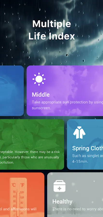 Life index function, providing advice on dressing, comfort, UV rays, colds, and car washing. This provides valuable reference for your attire and travel style.