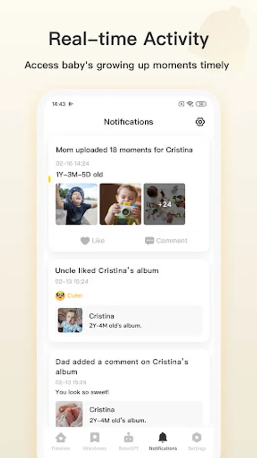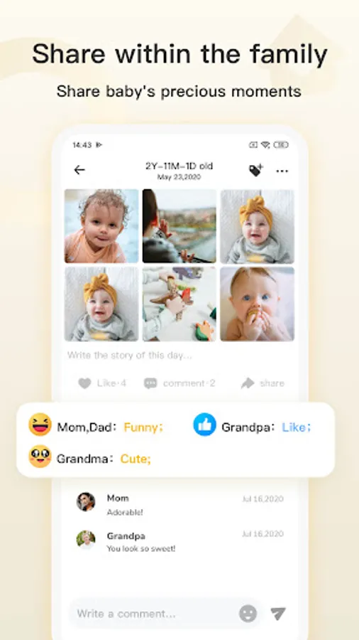 •LIKE & COMMENT. The interactive based on baby photos brings family members closer together.