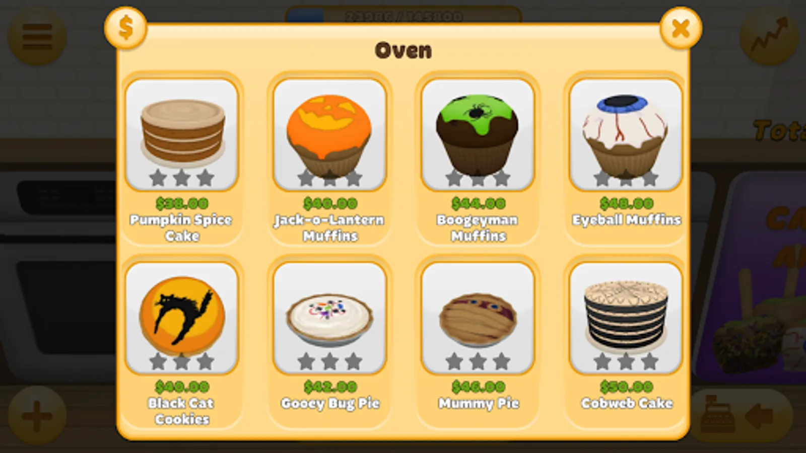 As you level up each bakeable recipe you’ll be able to increase the price of your baked goods and buy more ovens to keep up with your customer demand! Be careful though! If your customers can’t find what they’re looking for they’ll give you a negative rating which will impact your bakery’s popularity! Now that’s spooky!