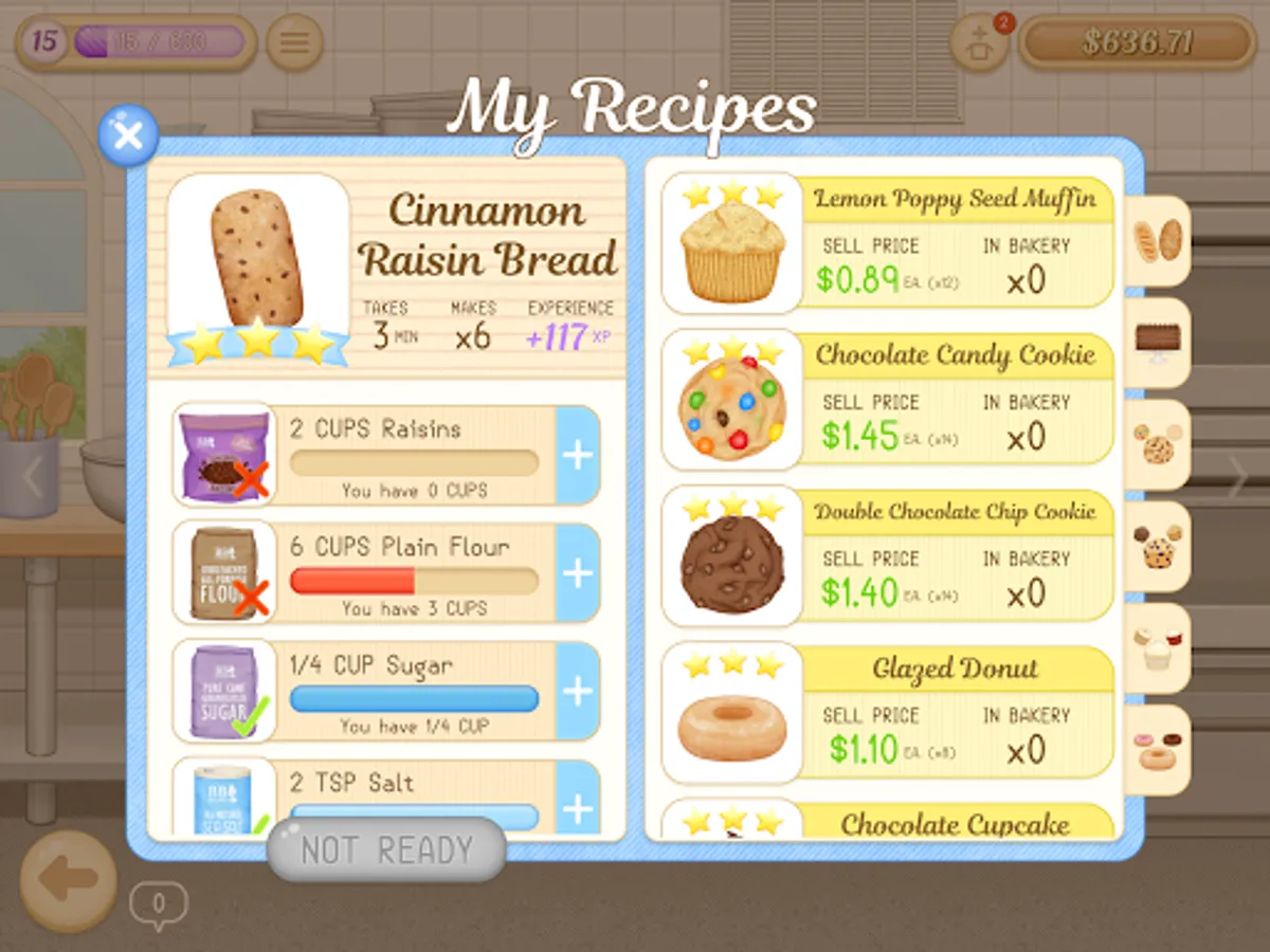 Each recipe calls for a specified quantity of different real-life baking ingredients you’ll be able to stock and bake with! As you level up you’ll be able to purchase ingredients in higher quantities, or bulk, to keep up with your baking demand.