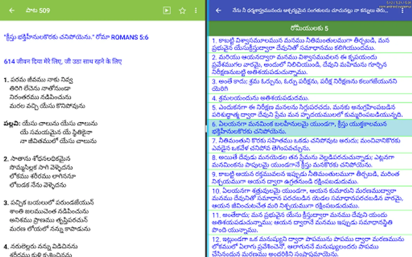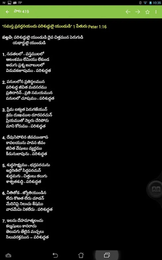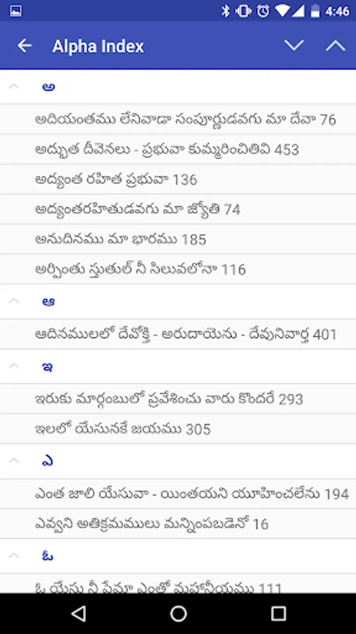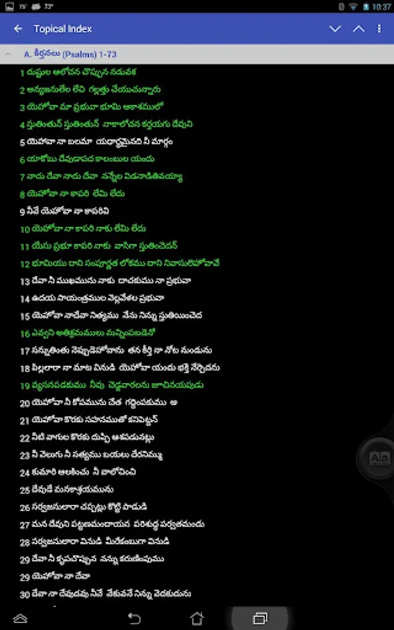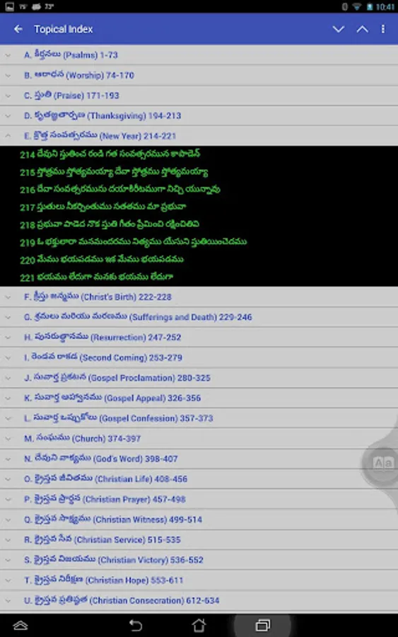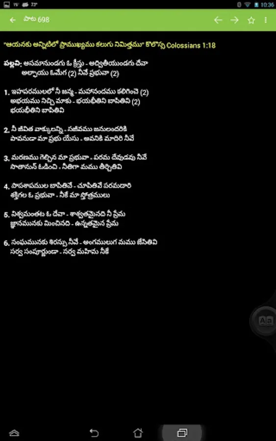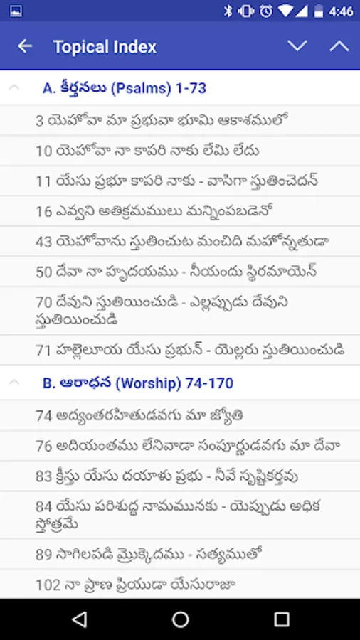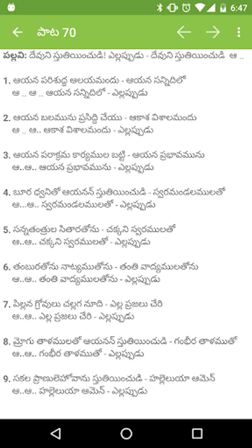 10) Want to read to Bible Theme Verse or Chapter of each Song? Just touch the bible verse at the top of each song. You have to install 'Telugu Bible' first time. Later come back and touch bible verse(s) of each song. You will be taken to Telugu Bible book, chapter and verse. Example for Song 1, touching the top bible verse takes you to Psalm 1. Back button takes to Song 1. Please always update 'Telugu Bible' app to the latest version.