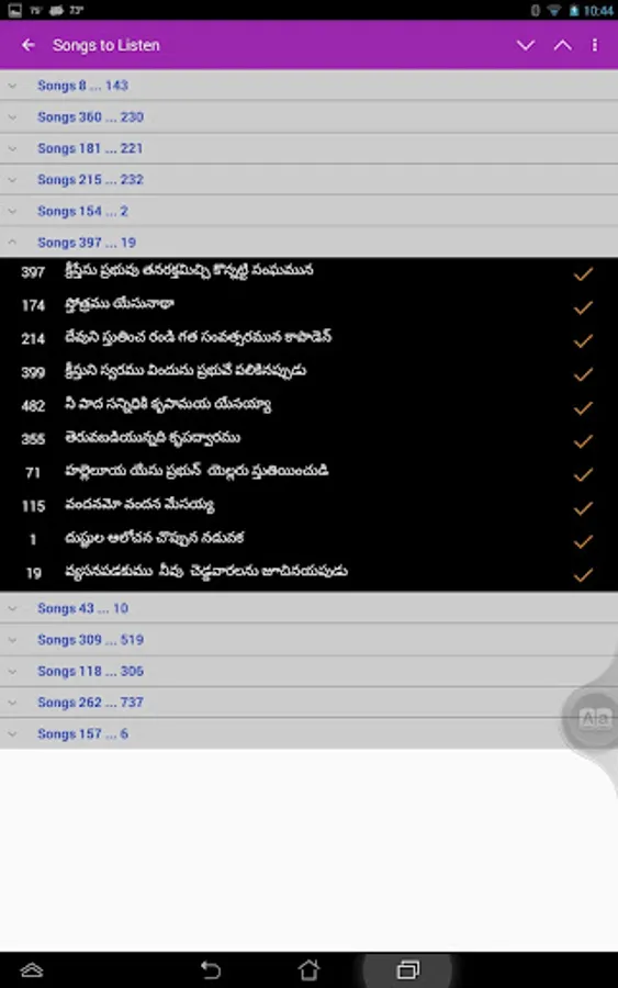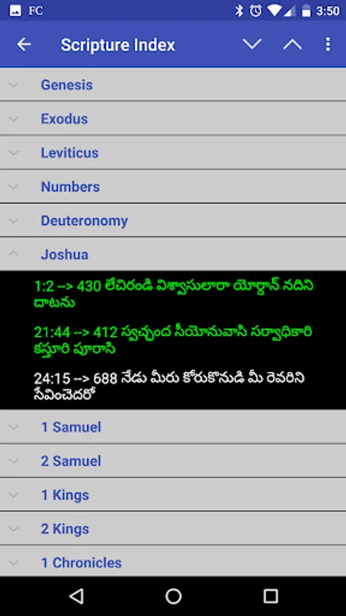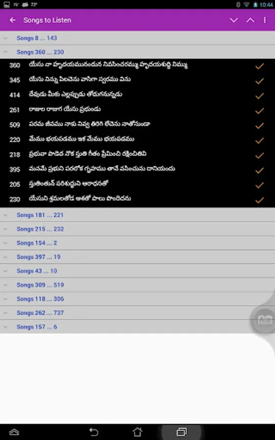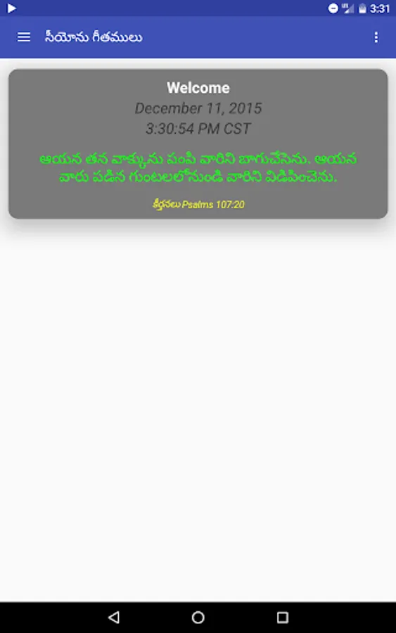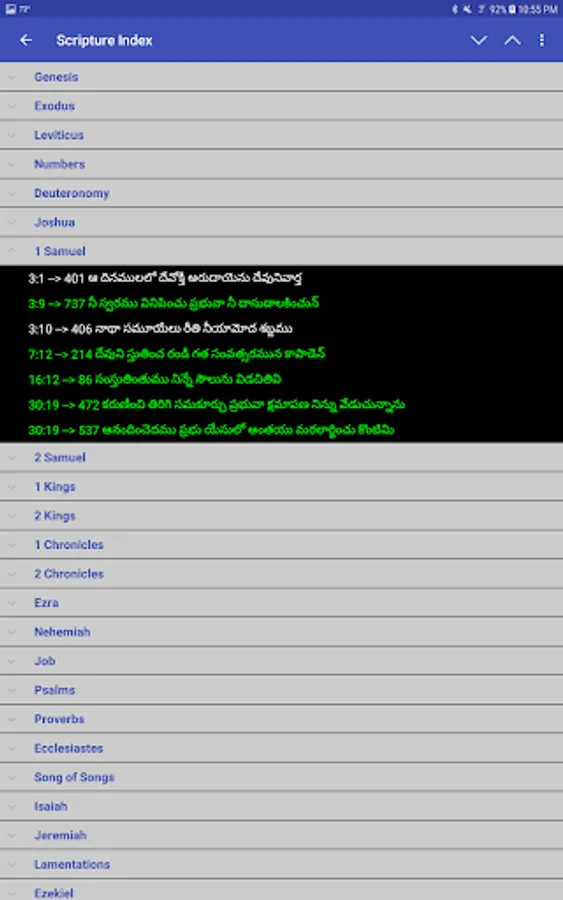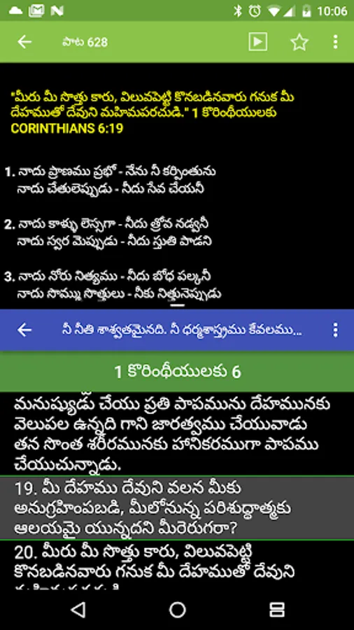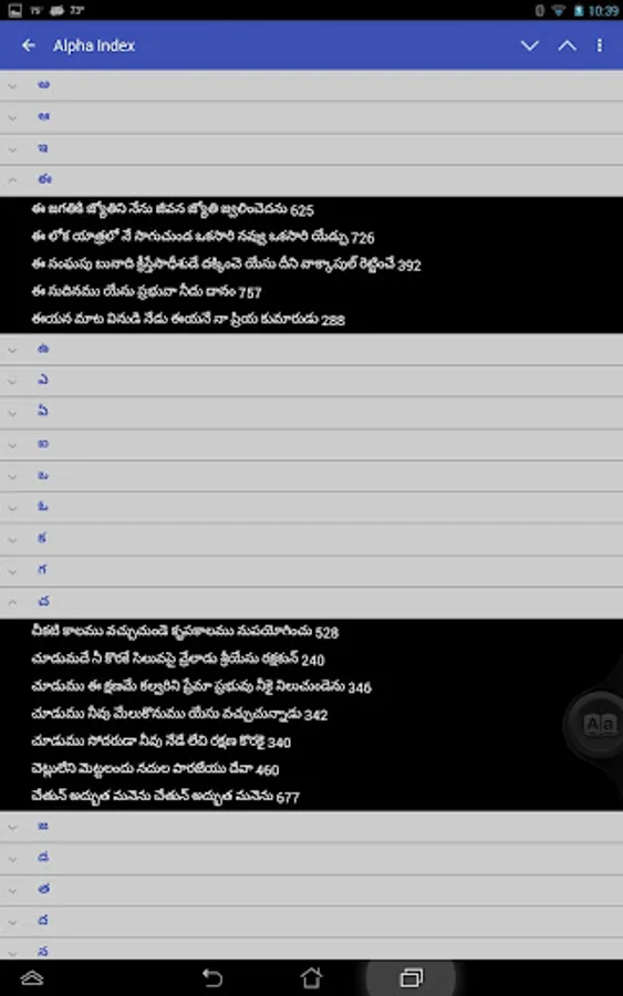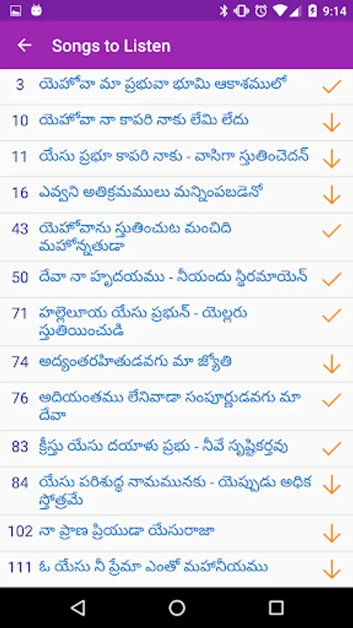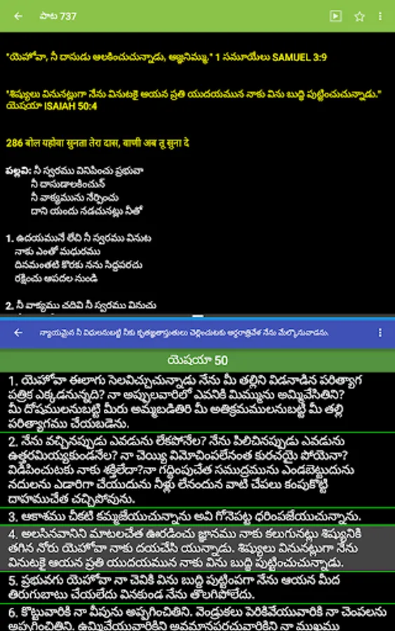 10) Want to read to Bible Theme Verse or Chapter of each Song? Just touch the bible verse at the top of each song. You have to install 'Telugu Bible' first time. Later come back and touch bible verse(s) of each song. You will be taken to Telugu Bible book, chapter and verse. Example for Song 1, touching the top bible verse takes you to Psalm 1. Back button takes to Song 1. Please always update 'Telugu Bible' app to the latest version.