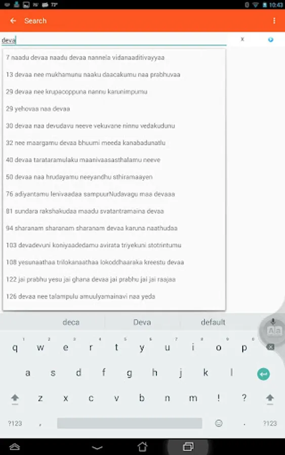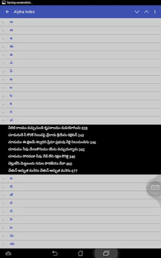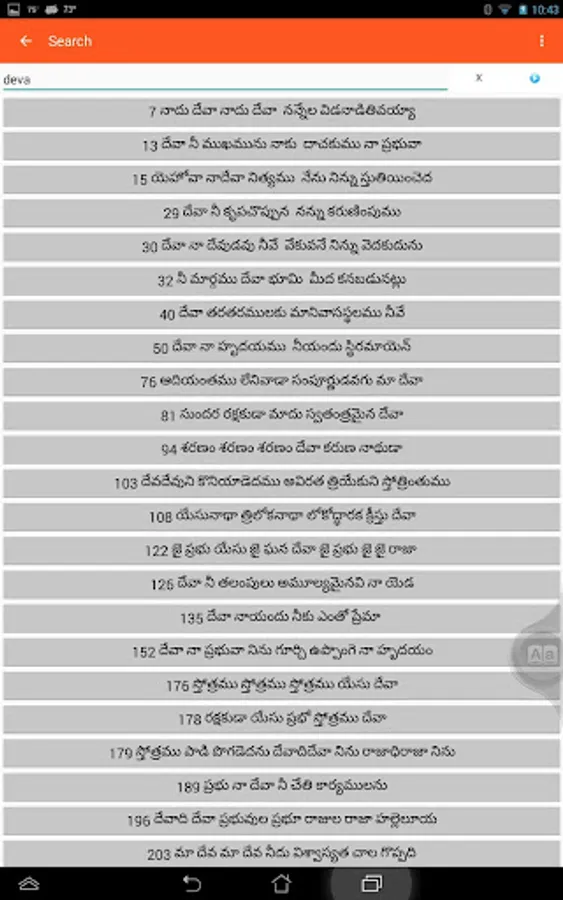 4) Search by song number or Telugu word (example యేసు) in English (example yesu). Search gives results as you type. Scroll through songs to find yours. Minimum two characters needed (example 22 or ye).