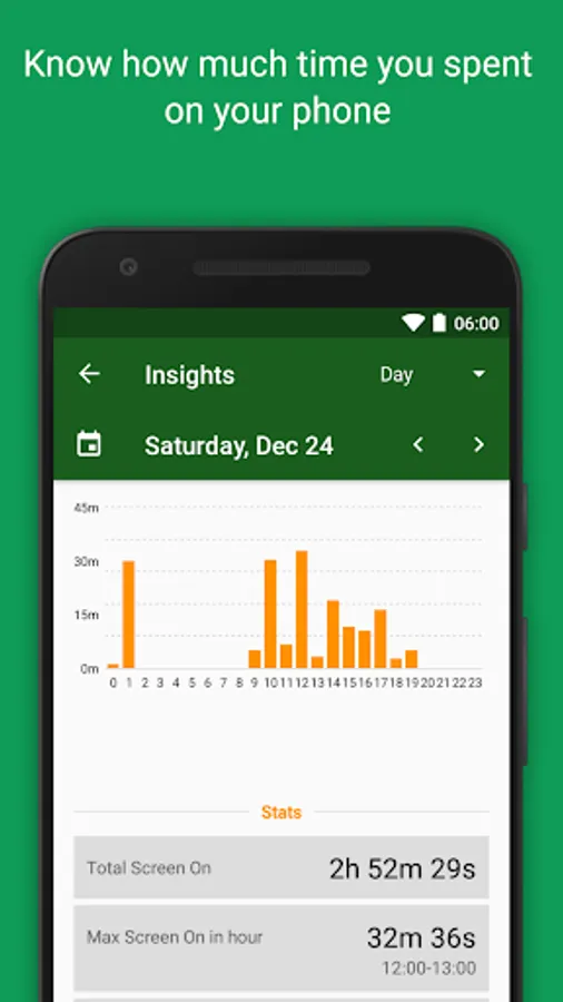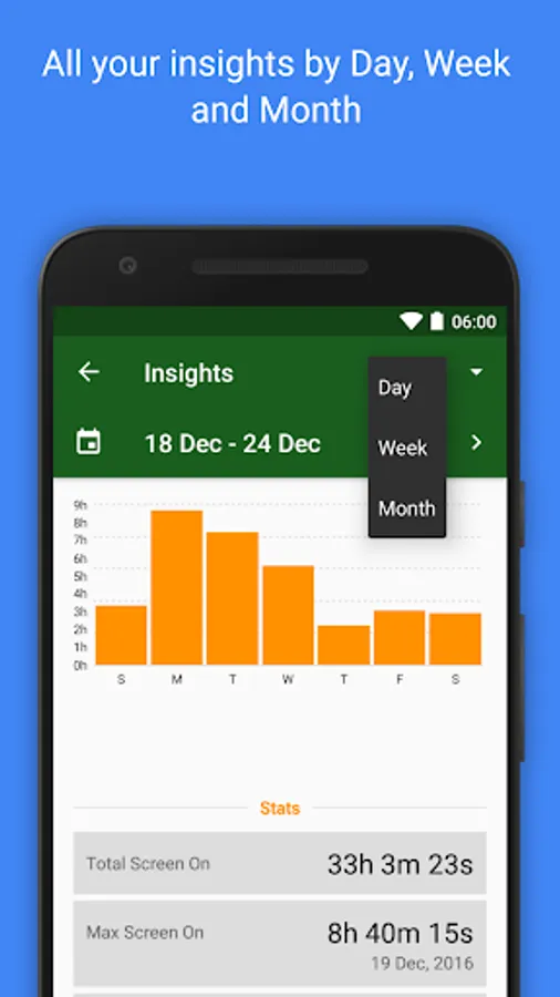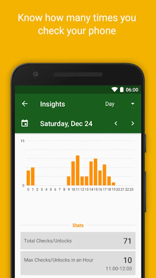 You can see how many times you have checked your phone and how much time you spent on your phone. All of this data can be filtered by Day, Week and Month views.