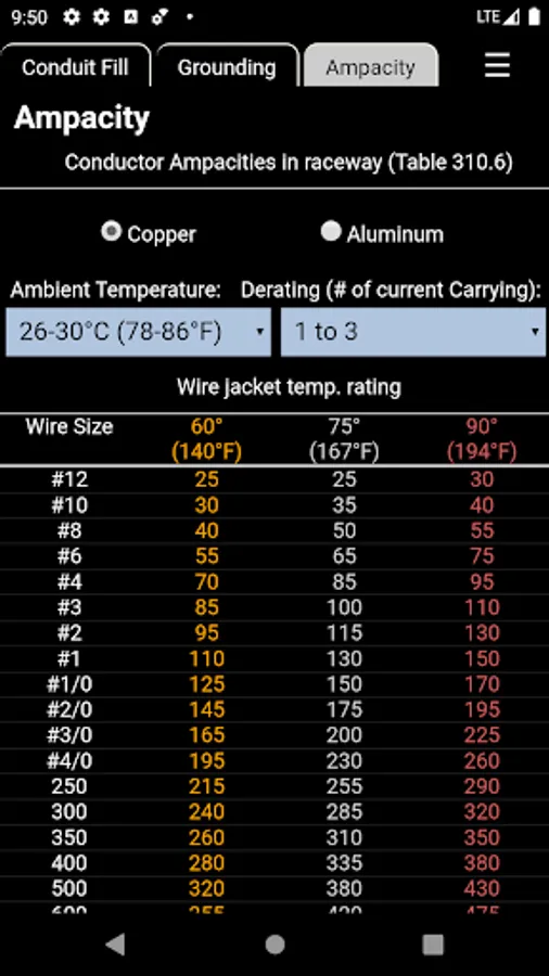 Wire ampacities with derating and temperature correction