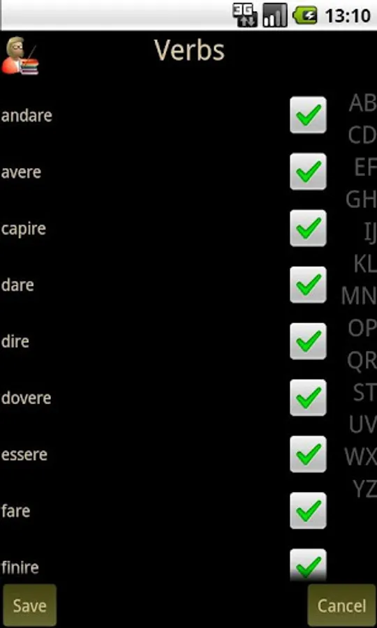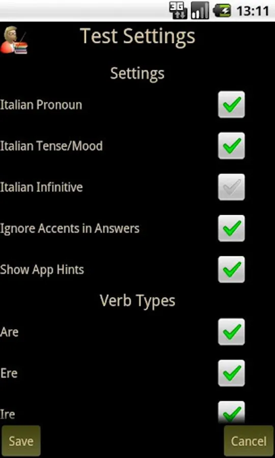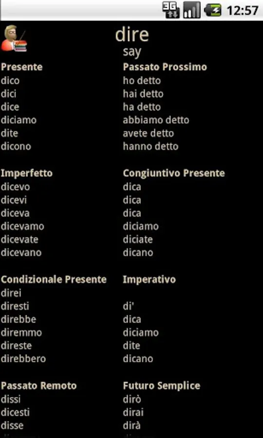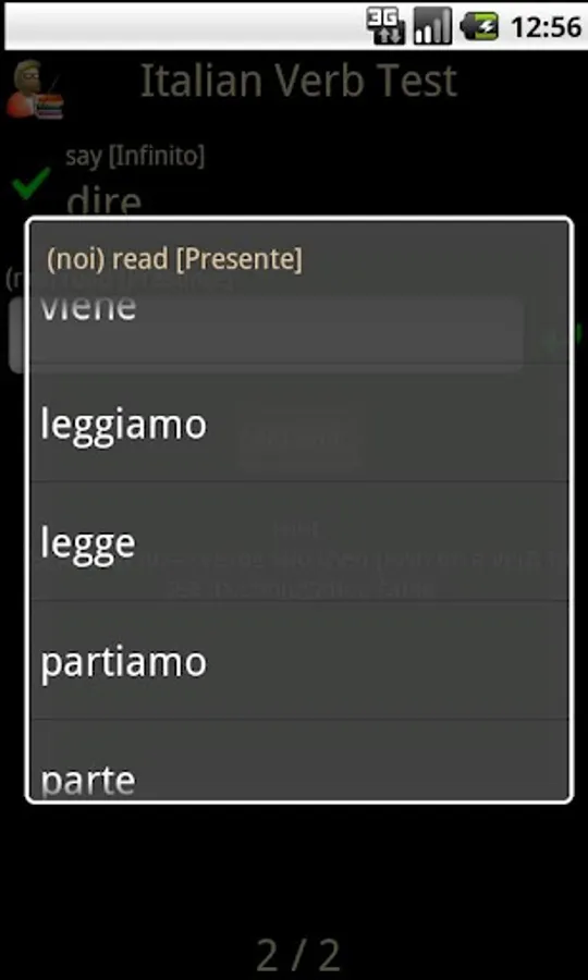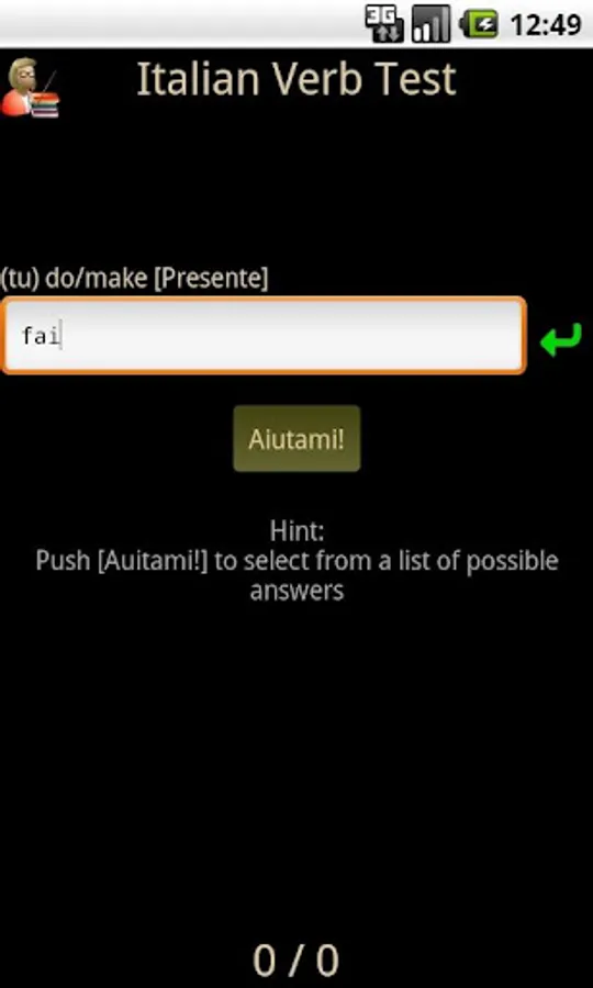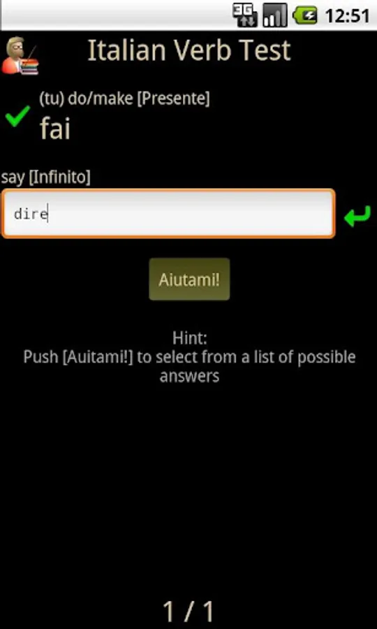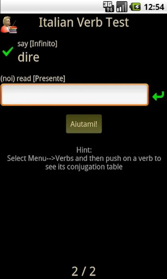 Italian Verb Test Lite allows you to test yourself on Italian verb conjugations. You are asked to translate a verb from English to Italian, given the pronoun and tense/mood. You can then either enter the answer or select it from a list of suggestions. The correct answer is then shown and your score updated if you got it right.