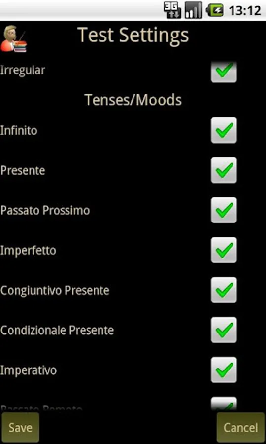 Italian Verb Test Lite will test you on any combination of the following tenses/moods.