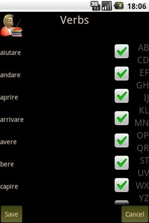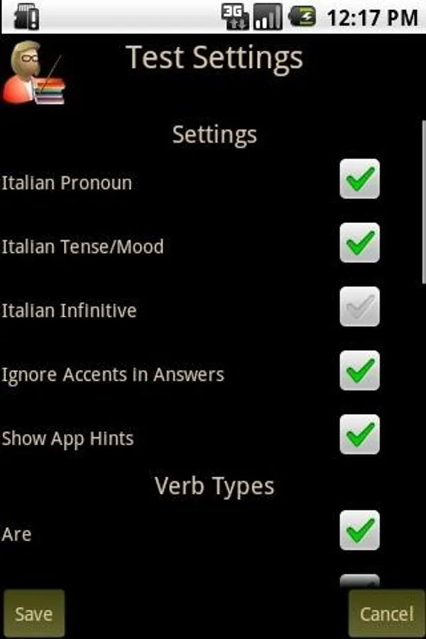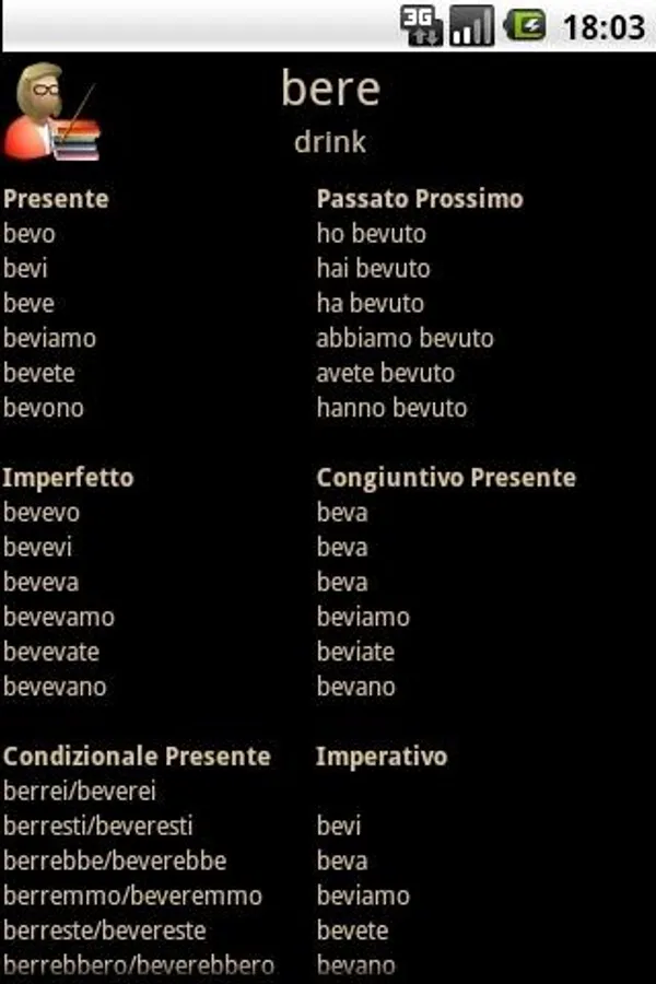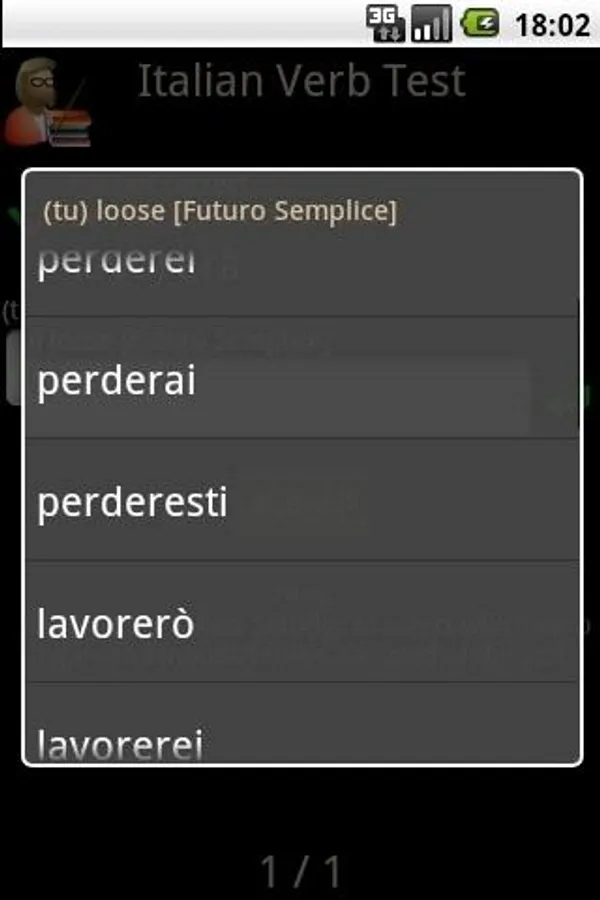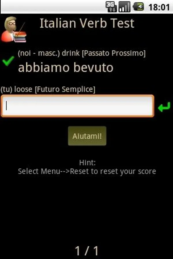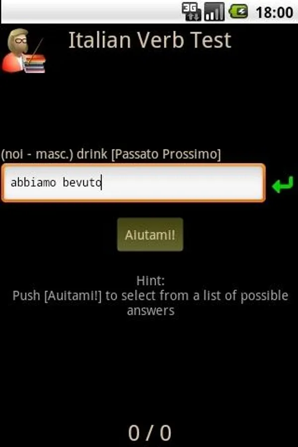 Italian Verb Test Pro allows you to test yourself on Italian verb conjugations. You are asked to translate a verb from English to Italian, given the pronoun and tense/mood. You can then either enter the answer or select it from a list of suggestions. The correct answer is then shown and your score updated if you got it right.