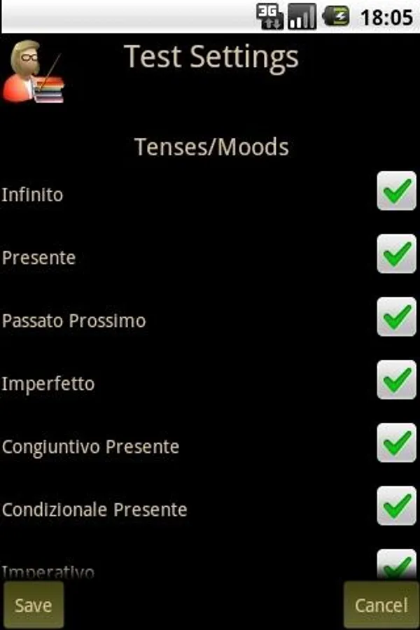 Italian Verb Test Pro will test you on any combination of the following tenses/moods.