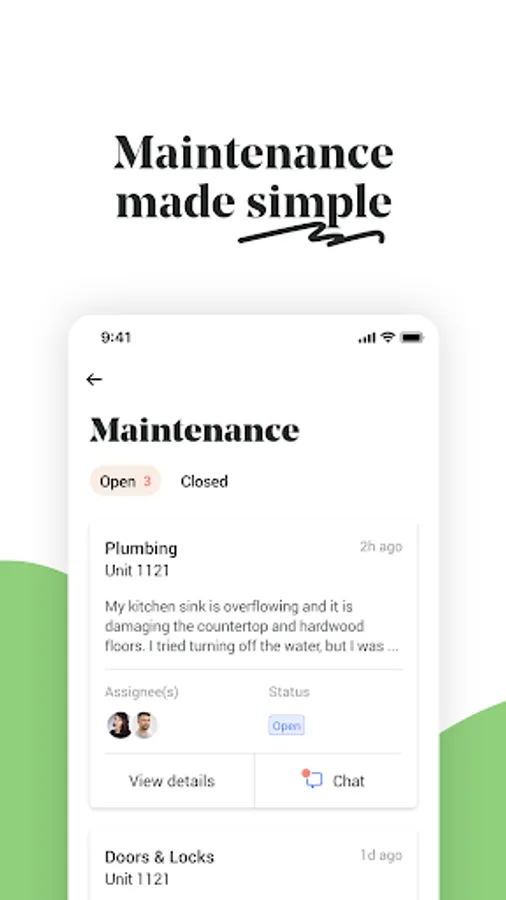 • Submit maintenance requests with photos and videos and automatically receive status updates.