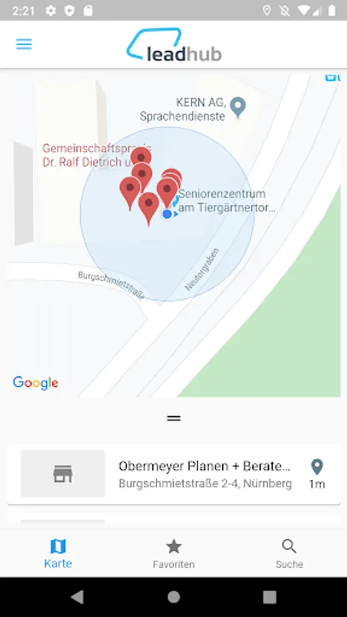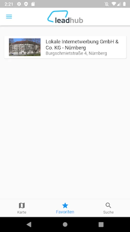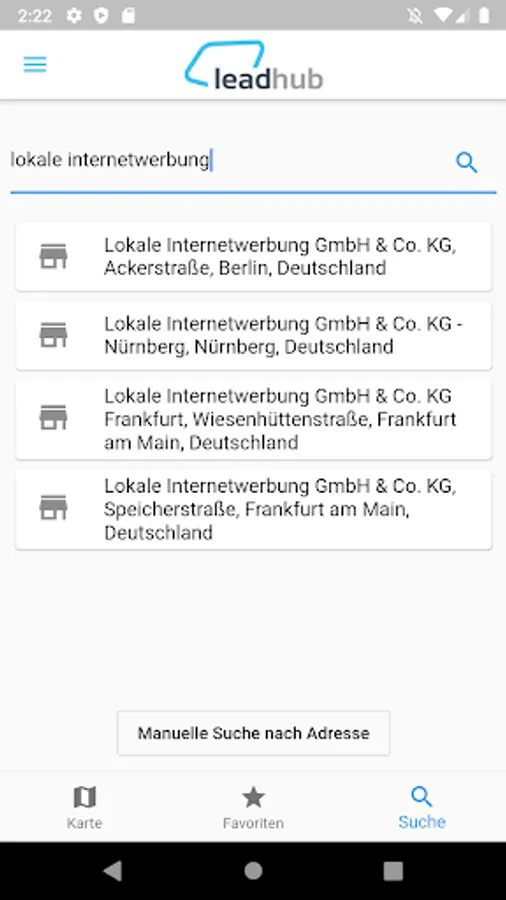 The app offers you two options: either start the search around your current cell phone location and select the appropriate company or enter the company data in the search menu. Now the leadhub business scan checks whether and how the company is found in publicly accessible online company directories.
