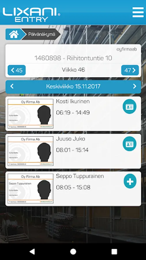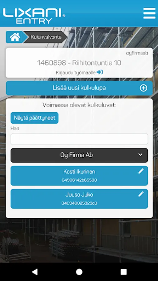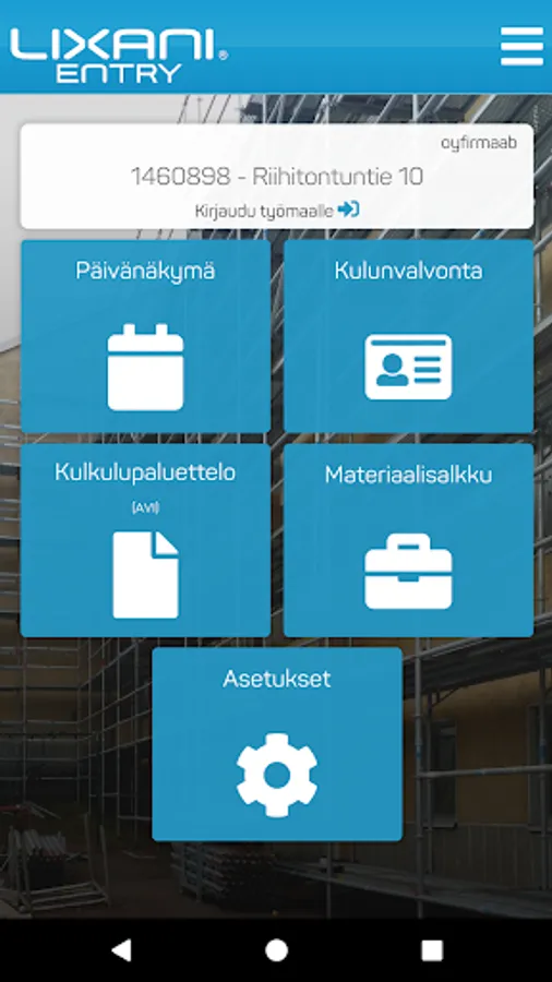 Lixani an entry by means of easily take care of your construction company worksites access control. Access rights can be determined ports, time of day and the weekday and weekend days, according to. The application is able to take into account also the employees of subcontractors and their työaikamerkintänsä. The application allows you to store Site-pictures and important documents. In addition, you can make the tax authorities to construction workers and job announcements.