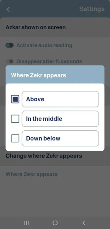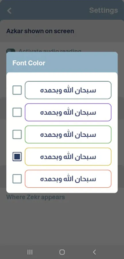 - Control the selection of the azkar that you want to appear on the mobile screen