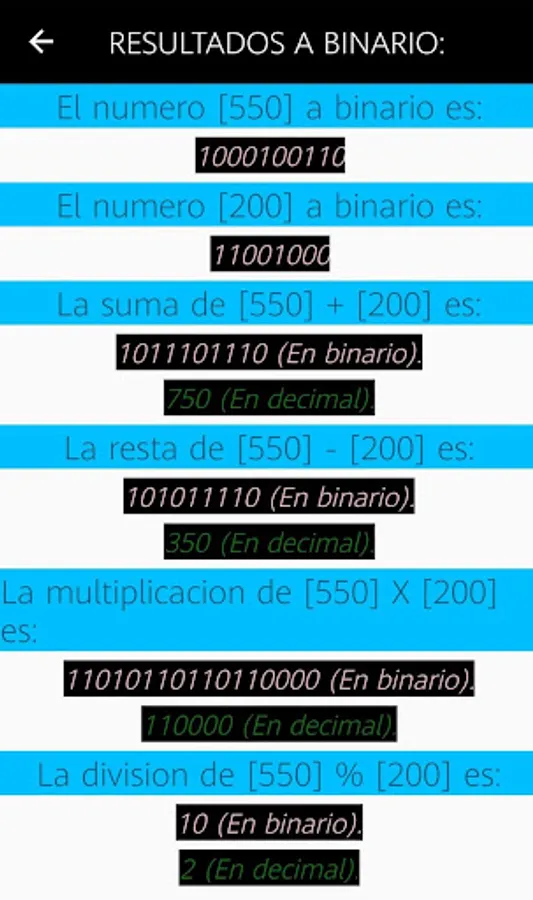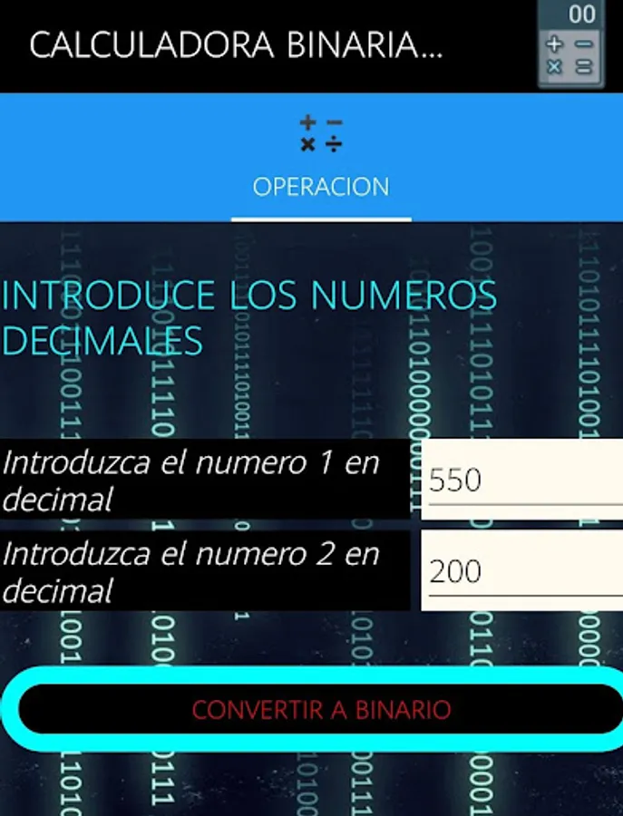 Enter two numbers and get the result in binary of each operation, addition, subtraction, multiplication and division of both numbers.
