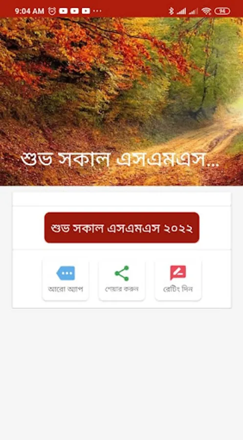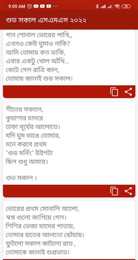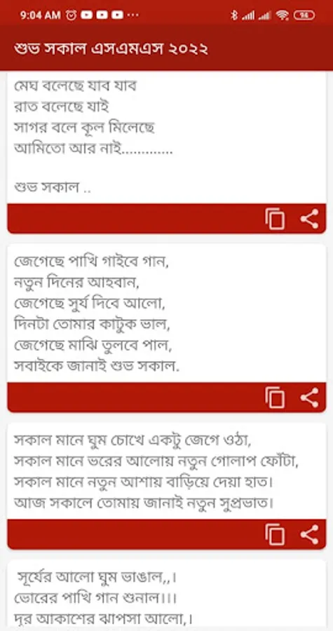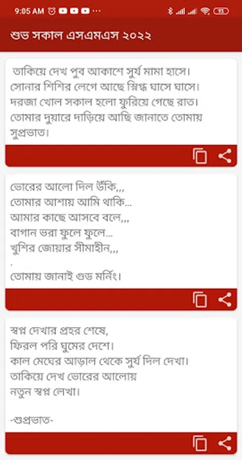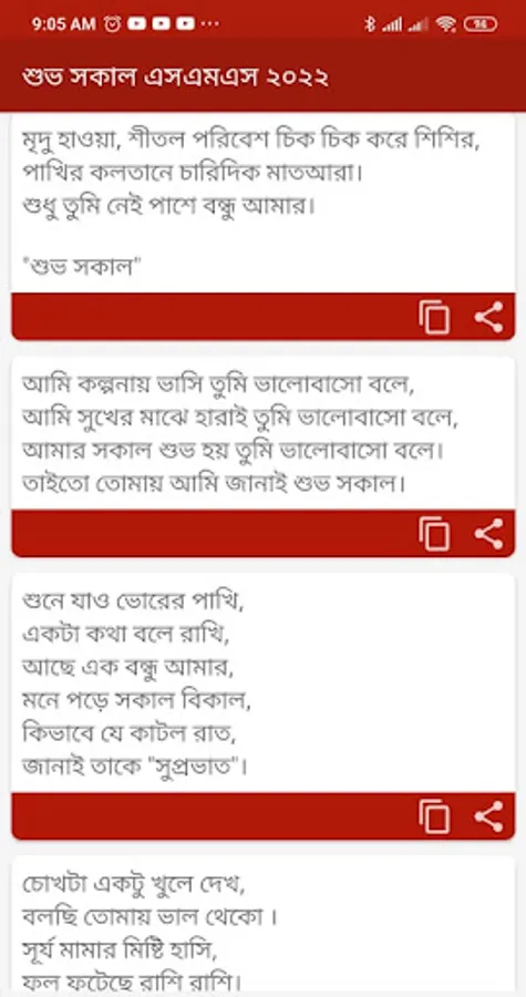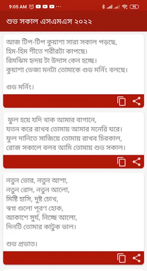 In this “good morning sms” app is the lots of New Collection of “shuvo sokal sms” and its completely free. You can send eaisly SMS to your favorite person. It is very easy to use. Just click share button. You can also read the app in offline mode without any problem.