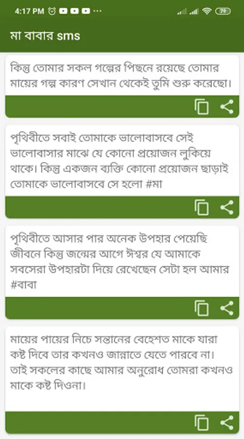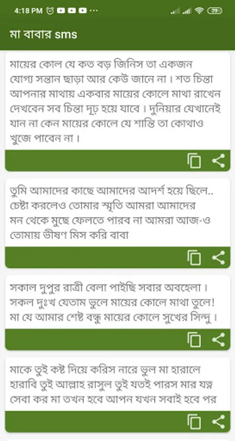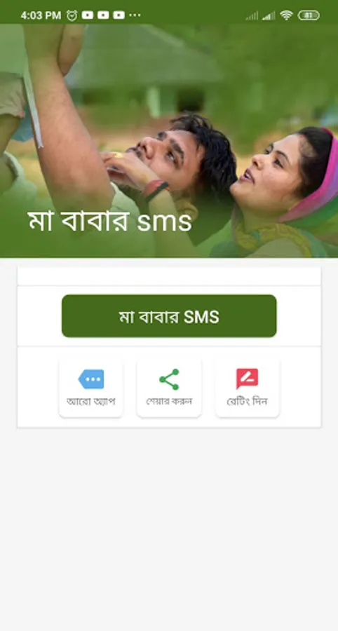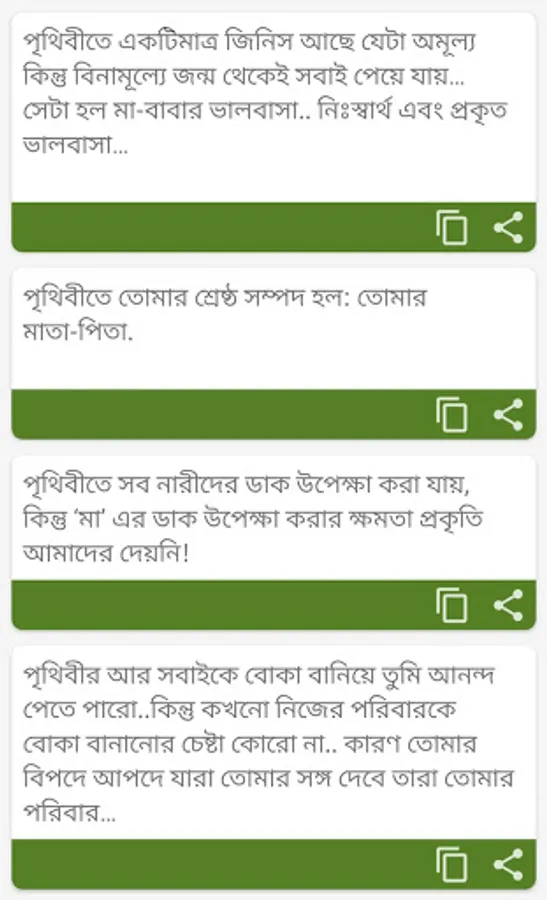 This ma babar status app is the lots of New Collection and Completely FREE. It is very easy to use. it is also include baba ma sms bangla. You can send eaisly SMS to your favorite person. Just click share button. You can also read the app in offline mode without any problem. So Friend… let's Start send SMS.