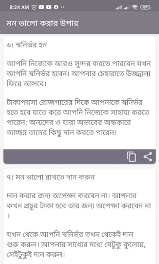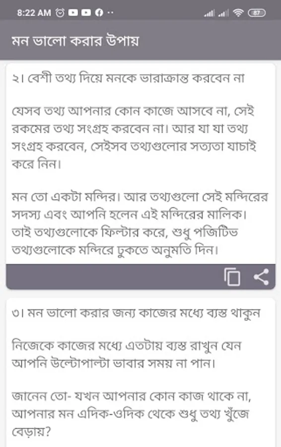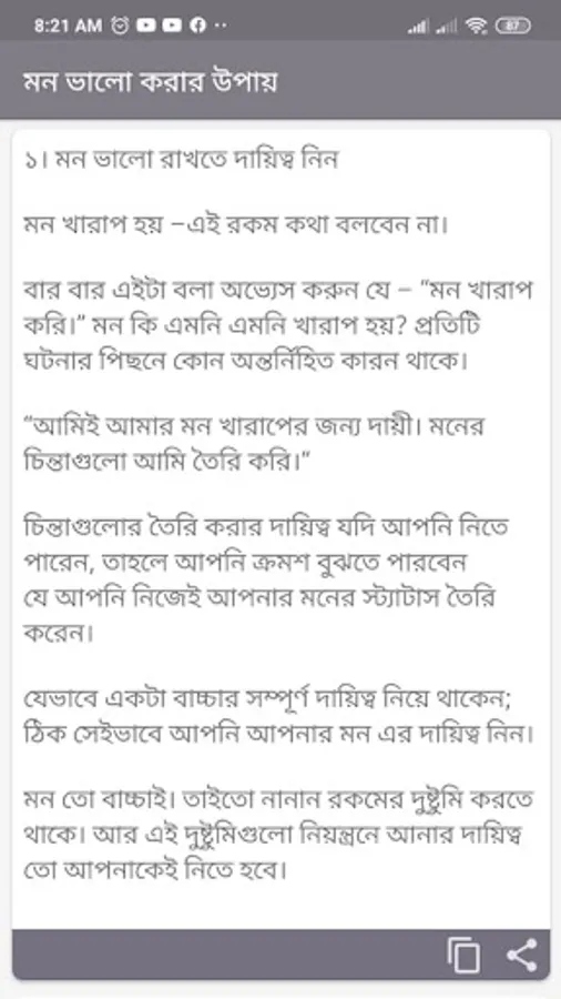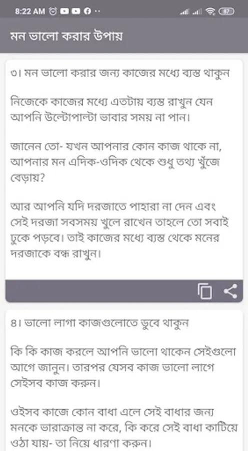 In this “mon valo korar sms 2022” app is the lots of New Collection of “mon valo korar upay” and its completely free. You can send eaisly SMS to your favorite person. It is very easy to use. Just click share button. You can also read the app in offline mode without any problem.