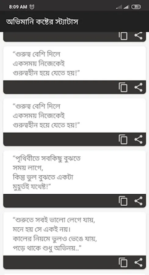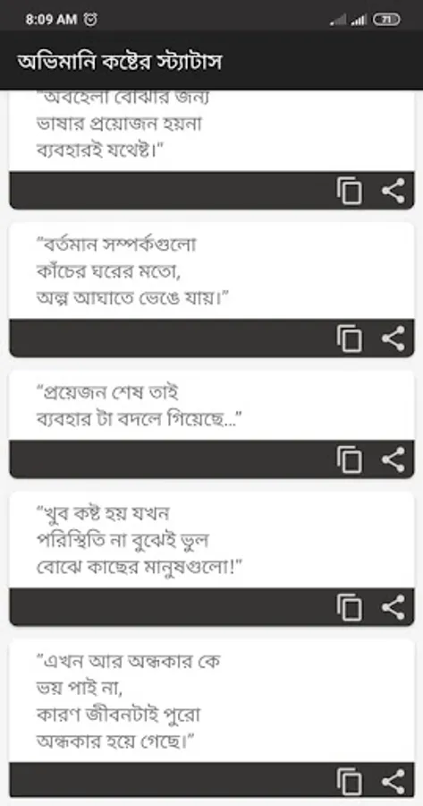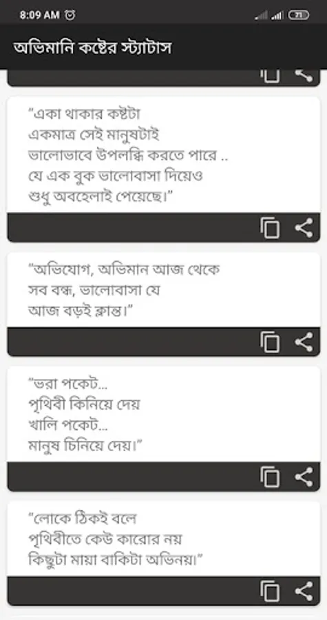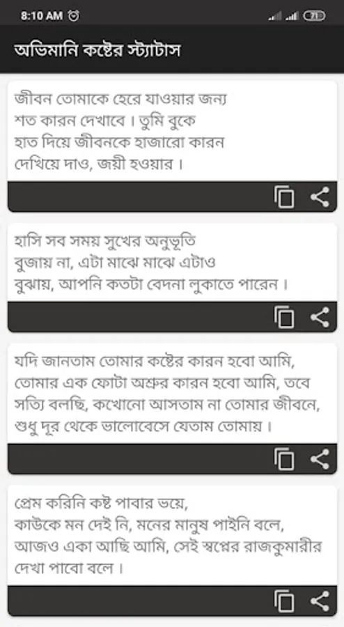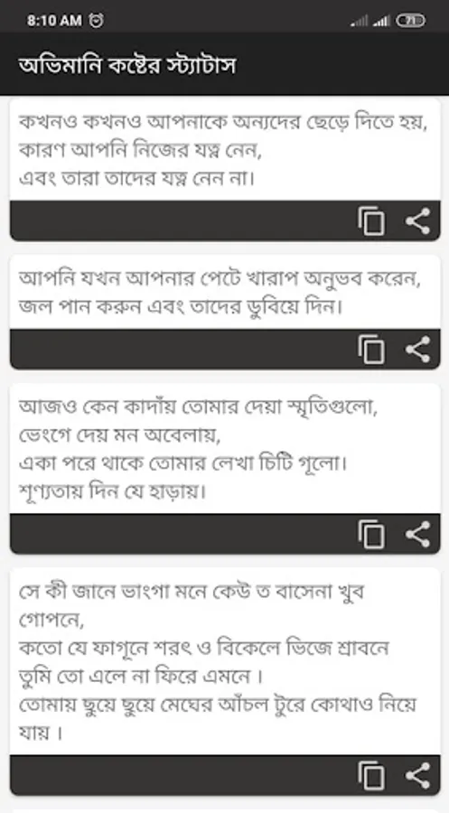 In this ovimani koster status app is the lots of New Collection and completely free. You can send eaisly SMS to your favorite person. It is very easy to use. Just click share button. You can also read the app in offline mode without any problem.