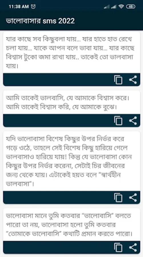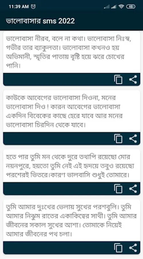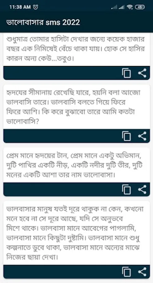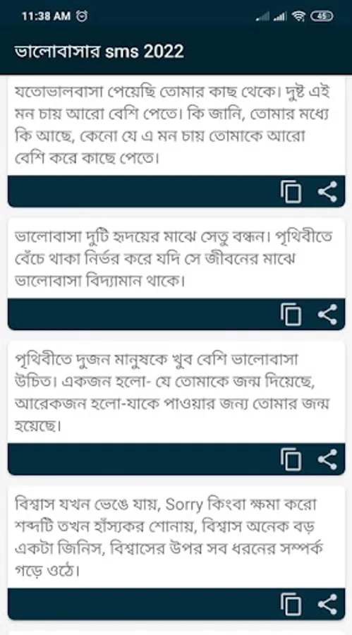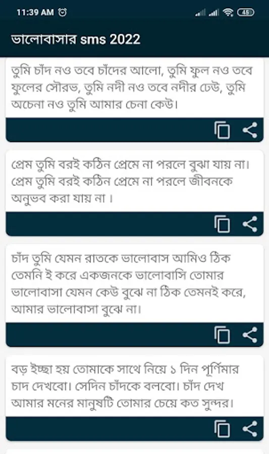 In this valobashar sms 2022 app is the lots of New Collection and completely free. You can send eaisly SMS to your favorite person. It is very easy to use. Just click share button. You can also read the app in offline mode without any problem.