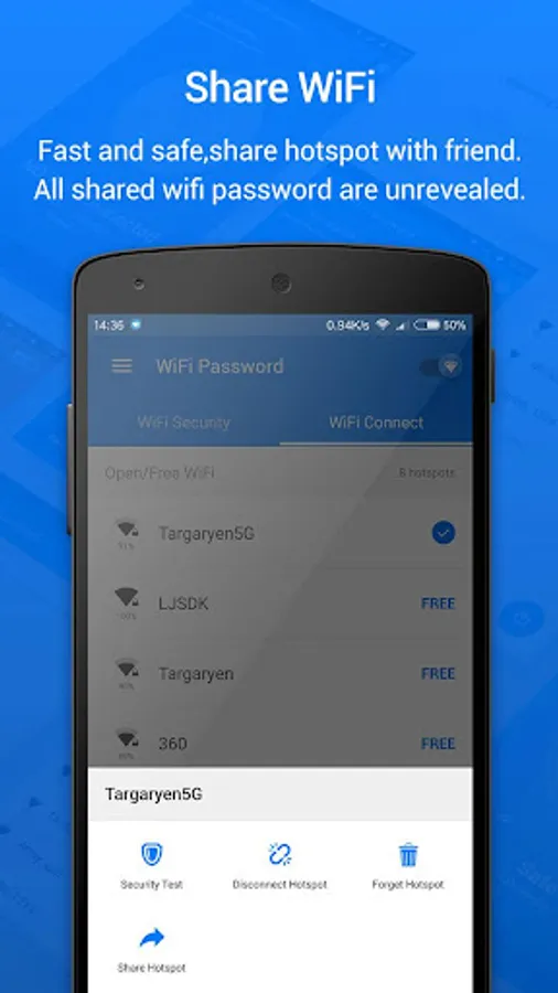 Just one click, connect wifi and share wifi password. "WiFi Password " will detect wifi automatically.