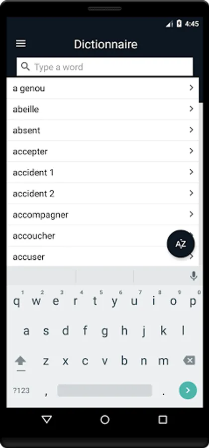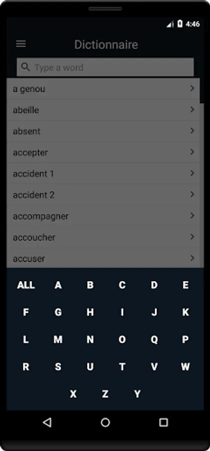 • «Dictionnaire» affiche une liste de mots et d'expressions signés, avec une description expliquée et une courte vidéo de chaque phrase.