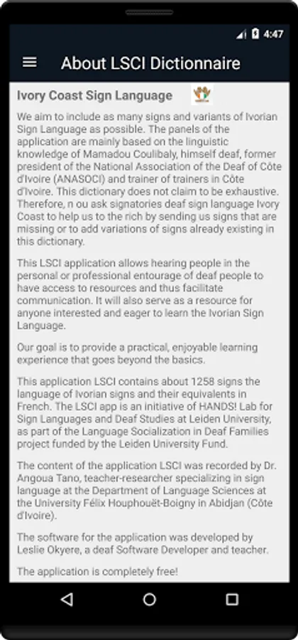 Cette application LSCI contient environ 1258 signes de la langue des signes ivoiriens et leurs équivalents en français. L'application LSCI est une initiative de HANDS! Lab for Sign Languages and Deaf Studies à l'Université de Leiden, dans le cadre du projet Language Socialization in Deaf Families financé par le Leiden University Fund.