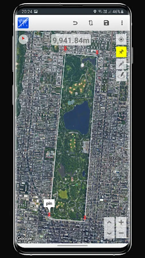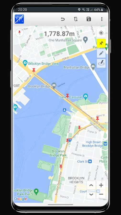 Map Distance Calculator application allows you to measure distances on a map by two ways. Firstly user can place pins on map and measure distance between consecutive pins. Secondly user can measure continuous path among points by pen tool. To do this user must click on map to place the pen first then long pressing on pen will activate the continuous drawing.
