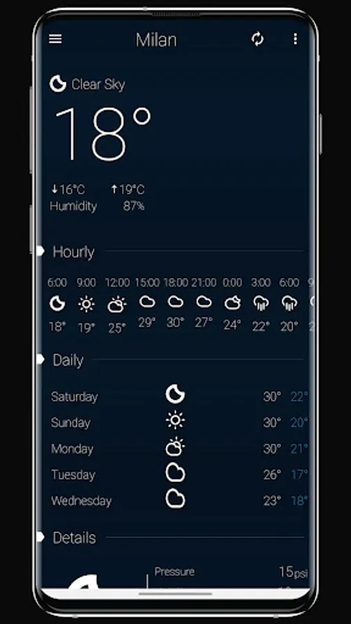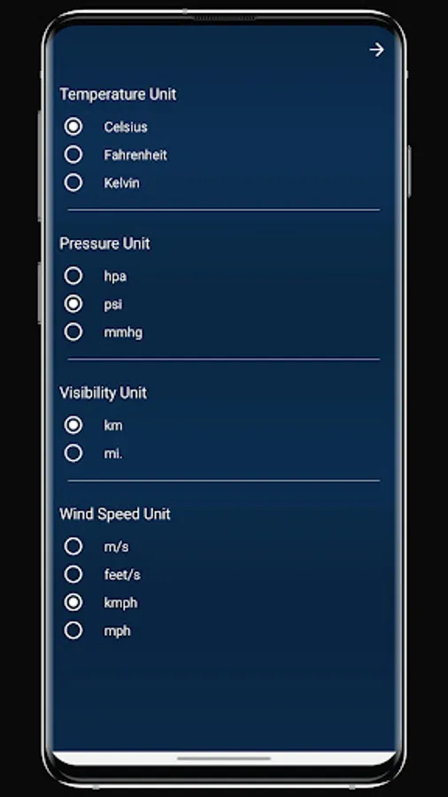 Temperature, atmospheric pressure, visibility, wind speed units can be changed in settings screen. Temperature units are Celsius, Fahrenheit, Kelvin. Atmospheric pressure units are psi, mmhg and hpa. Visibility units are km, mile. Wind speed units are m/s, feet/s, mph, kmph.