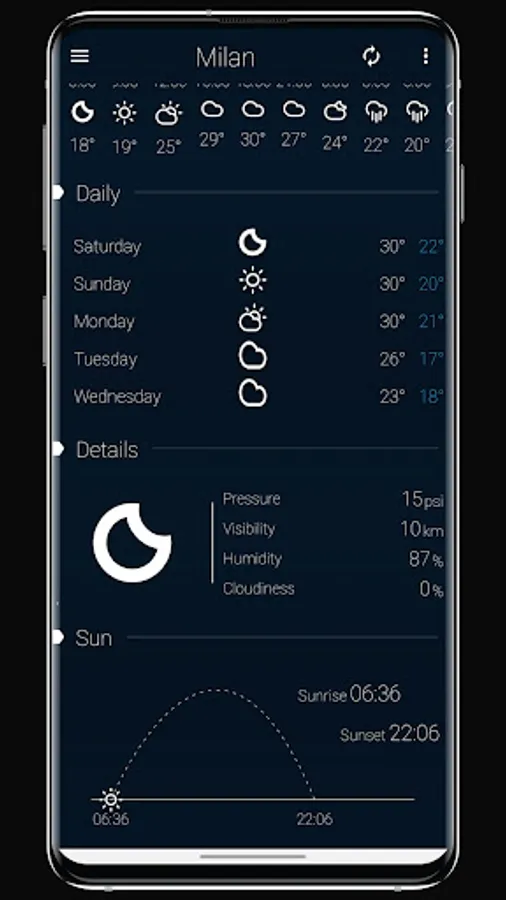 Wind speed, wind direction, current weather, current temperature, max temp, min temp and current humidity is shown on opening screen. Slide up for hourly weather, daily weather and today weather report details, sunset and sunrise times. Hourly weather section can be slides left.