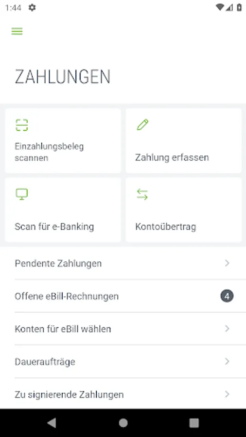 Payments: e-invoices, account transfers, payment slips scan, domestic bank payments (Prerequisite: Once before in e-banking detected), query pending payments.