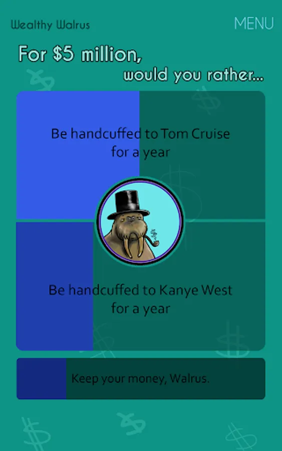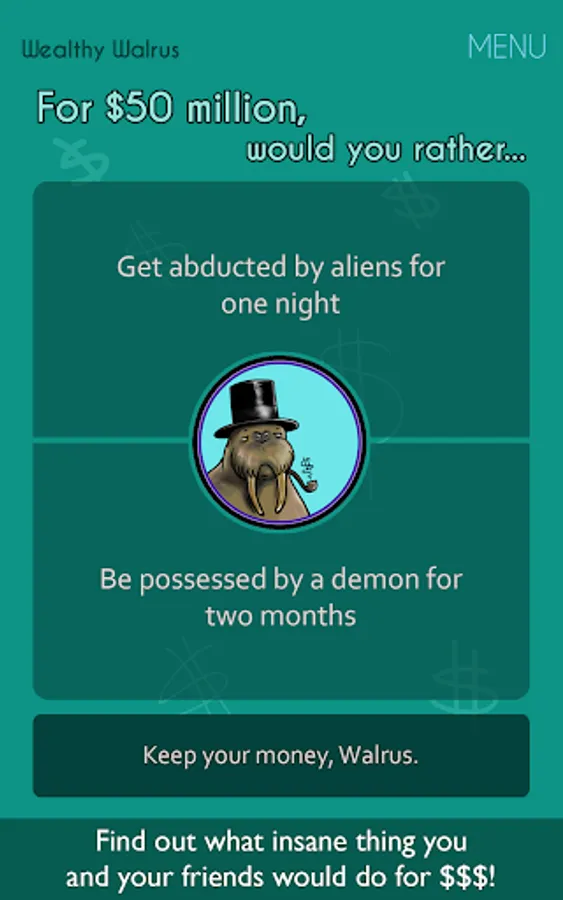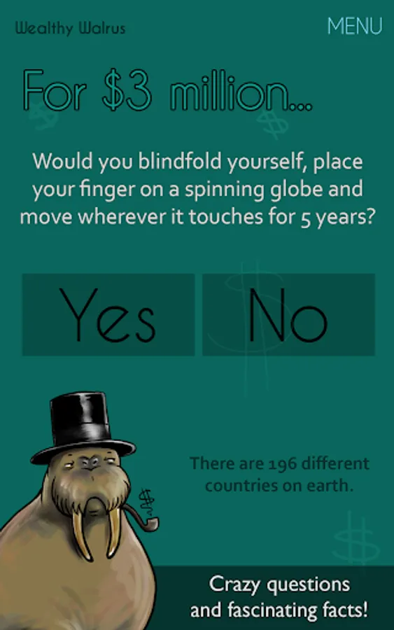 Meet the Wealthy Walrus... a former oil tycoon with a net worth of $11 billion dollars. He'll offer you huge amounts of money to do insane things you'd normally avoid at all costs.