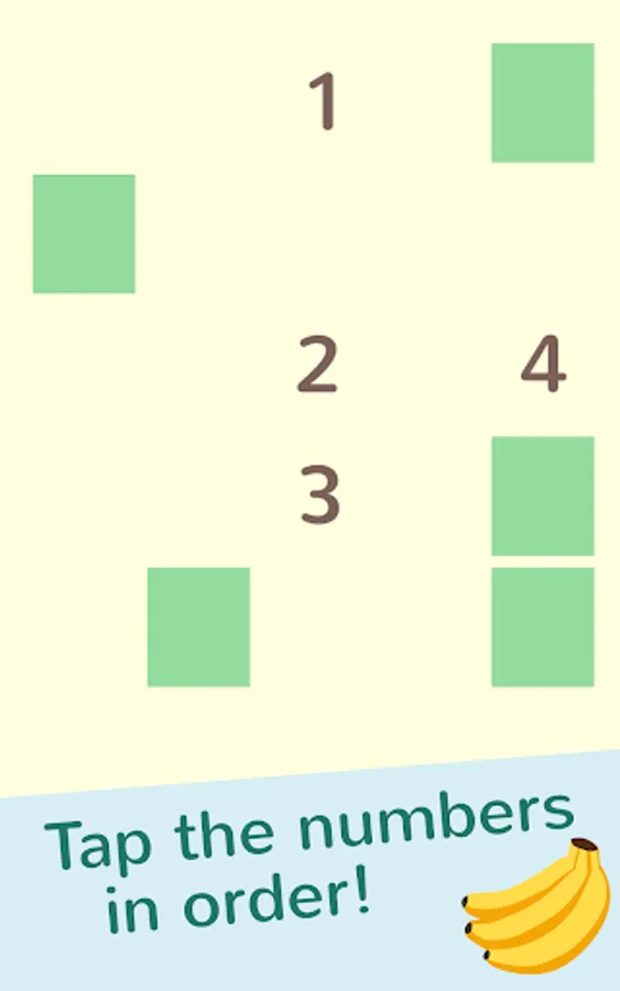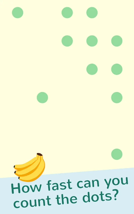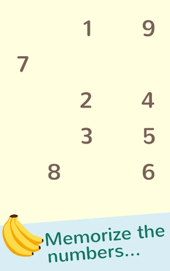 First, the player will memorize the spatial locations of the numbers. After some time, cards will cover up the numbers. The player has to tap the cards in the correct sequence. Recalling the sequence of numbers is a great way to improve your spatial and working memory. Some levels have fun distractions. Sometimes the cards move, or bananas will fly across the screen. These distractions keep the memory game interesting and will challenge your skills. Instead of cards covering up numbers, some levels involve dots that quickly flash on the screen. How fast can you count the dots?