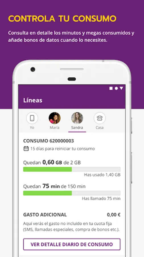 If you want to have control of your rate, download this app and save every month by controlling your data or voice consumption and manage your lines yourself comfortably and easily.