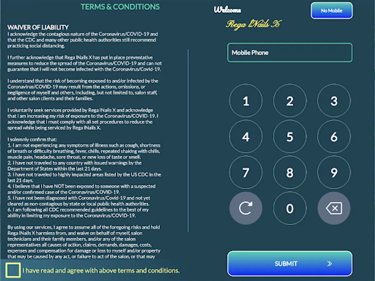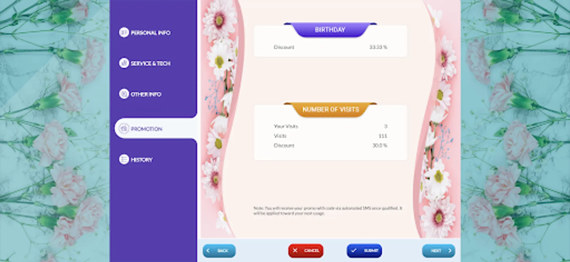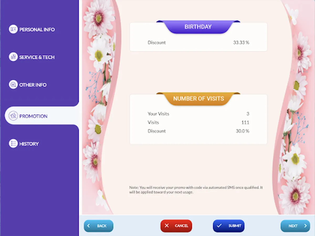 eCheck-in application is an add-on tool to our salon management solution, used to sign in customers with Fire Tablet devices. Instead of traditional paper check-in method, salons now can use Fire Tablets to collect their customer information, ranging from personal info such as name, mobile, email… to service preferences like types of service request, technician selections. Our check-in app allows the salon owners to set entry fields as required or optional, based on salon preference or demands. Since it is designed as a self-check in, the customers can take a glimpse at any available promo offered while registering as well as reviewing their usages record prior to making decision for their current service selections, if necessary.