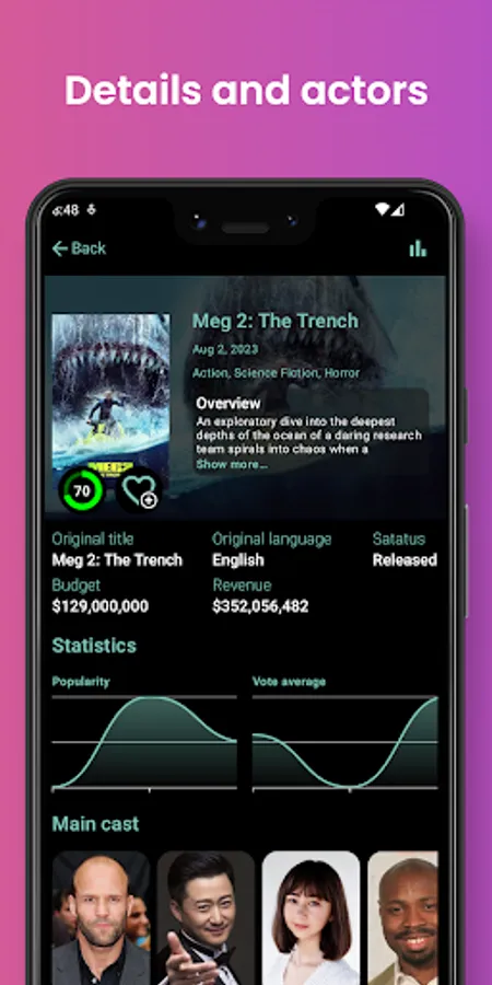 All the information belongs to The Movie DB (www.themoviedb.org), information that you can access quickly from your cell phone and consult data on your favorite movies and actors.