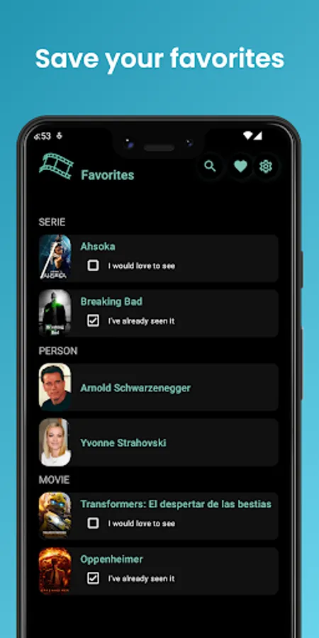 - Create your favorites list, so you don't forget titles you want to watch or have liked.