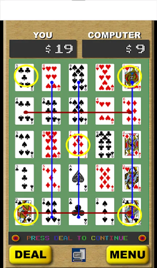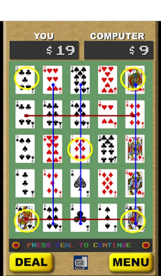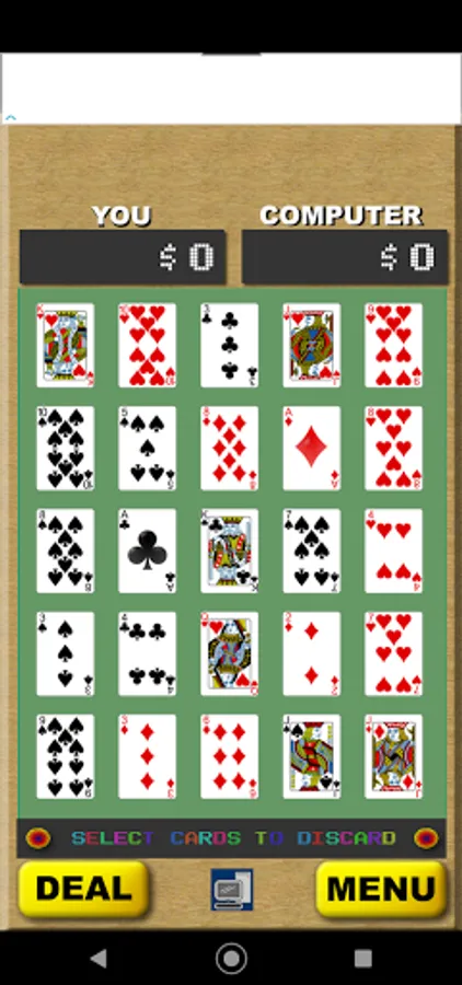 Full instructions in app explain fully, along with pay tables for each game. Game Play is as follows: You and the computer each have a standard deck of 52 cards. Each player is dealt 25 cards in rows of 5 five. The object is to form the most winning hands. Hands can be horizontal, vertical, diagonal, or the 4 corners and the middle. Kind of like in bingo. There are 13 possible winning hands in all. Choose which cards you want to discard then they are replaced from the remaining 27 cards in the deck. After the 2nd deal the scores are calculated. First player to get to the finish score wins.