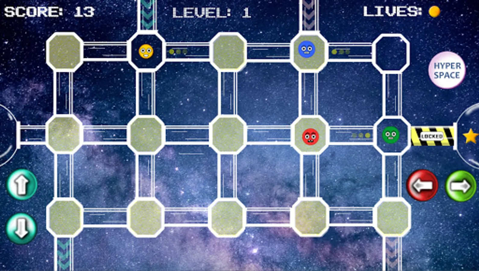 HyperLoop - an arcade style game where you move your player around the HyperLoop, visit every chamber to unlock the exit. Get to the exit while avoiding the bad guys. You get 3 lives to try to achieve the high score. If you get surrounded you can press the Hyperspace button to flee elsewhere in the Hyperloop. There is no time limit for each level. Good Luck.