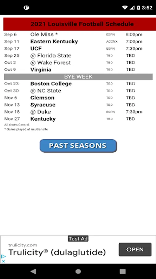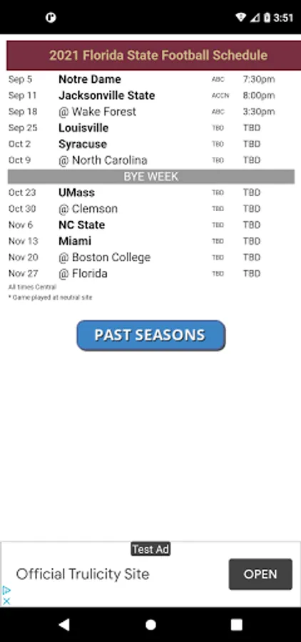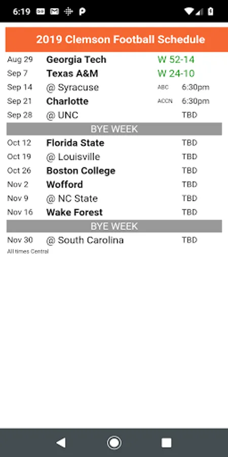 Boston College, Clemson, Duke, Florida State, Georgia Tech, Louisville, Miami, North Carolina, NC State, Pitt, Syracuse, Virginia, Virginia Tech and Wake Forest. When, where, who and how to watch. All information will be updated as soon as it becomes available. The final score of each game will be displayed after the game finishes. Past seasons this app has shown can also be easily looked up, so download once and use this app over and over.