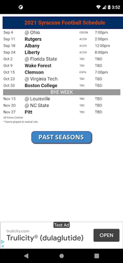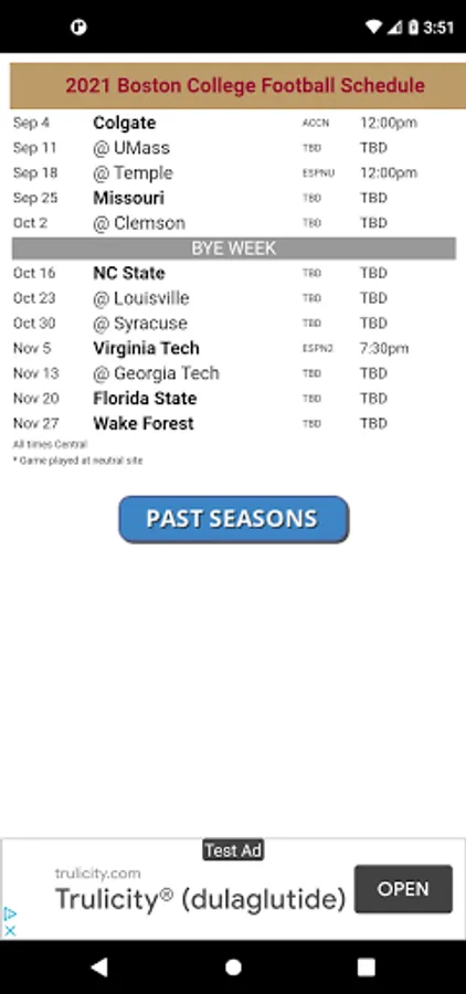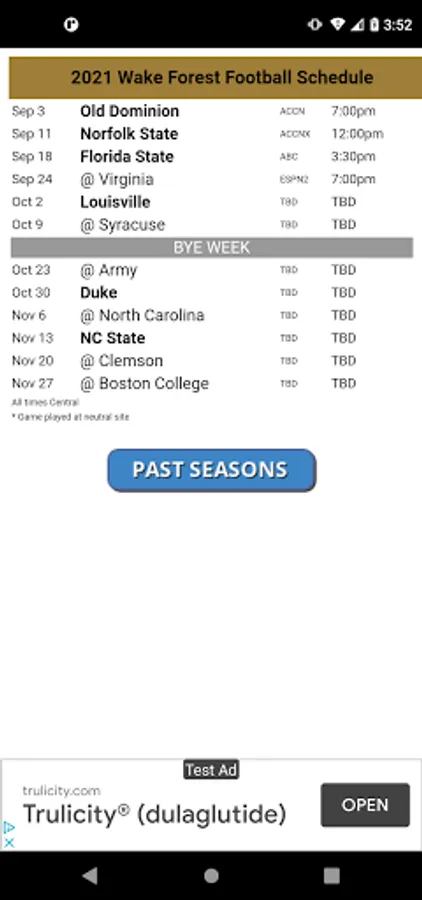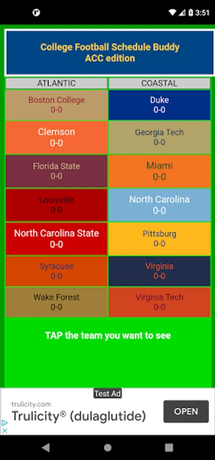 This is a FREE college football app that supplies information and news to the universities fans. It shows the current seasons football schedule and scores when they become available. This app is not affiliated with the ACC or its universities. This information is used under the fair use provision of the Copyright Act for reporting information.