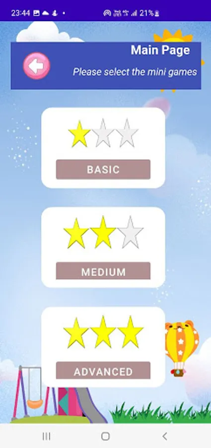 This app has three level games that is basic, medium and advanced. Firstly, the basic level has gesture recognition game and voice recognition game. While for medium level, it has puzzle game and selection game. Thirdly, advanced level has maze game and hint and find game.