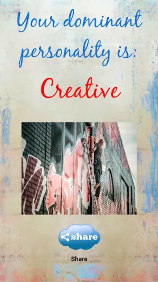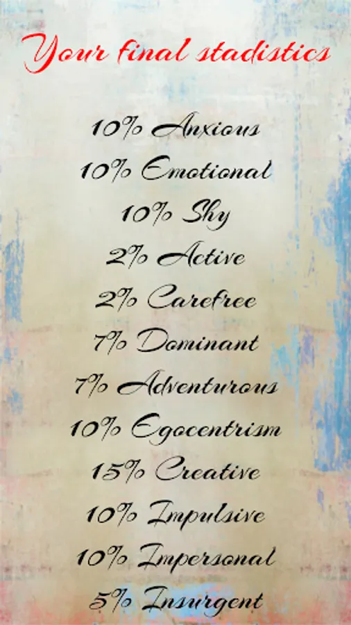 At the end of the test, the most dominant personality in the user is identified and the statistics with the final percentages are shown.