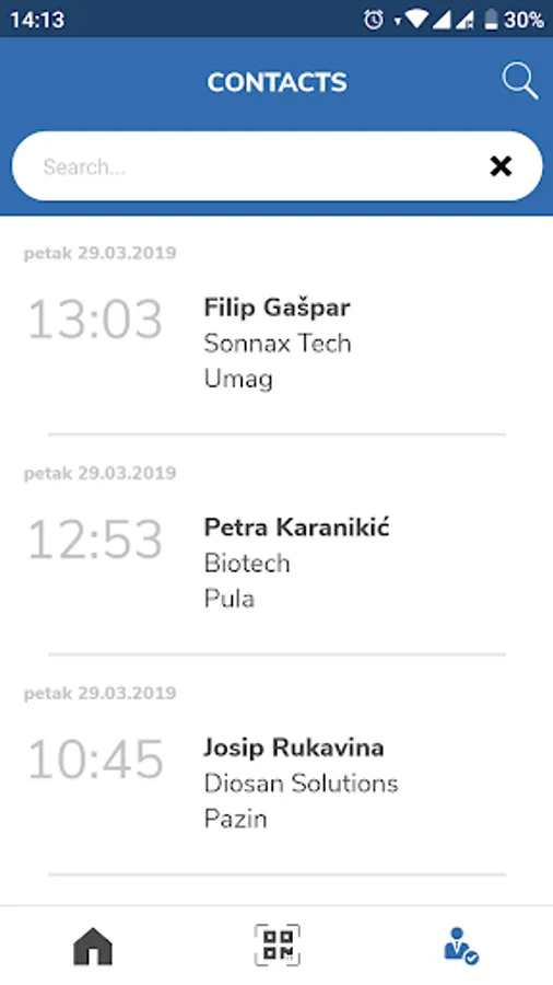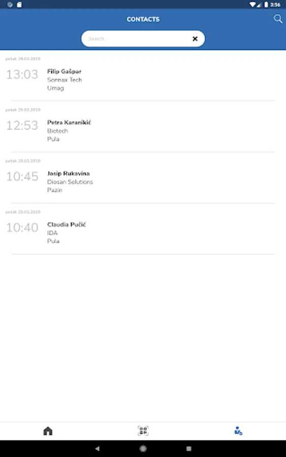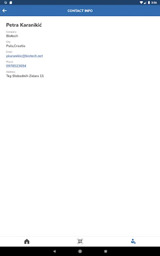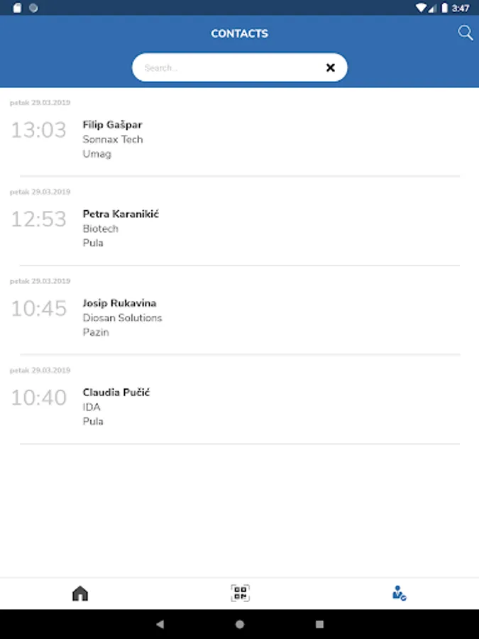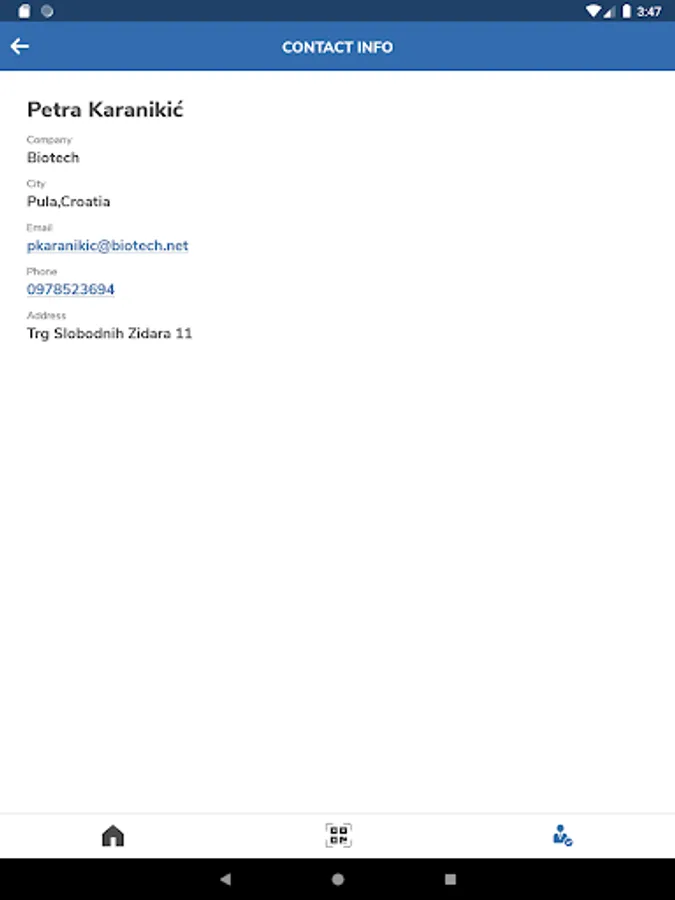 The app automatically generates the database of potential business contacts and customers, keeps track of sales presenters statistics, and for the fair attendants, it eases the acquisition of new contacts, business cards, catalogs and other promotional material by automatically sending contact information to their e-mail inbox by scanning other app users QR code.