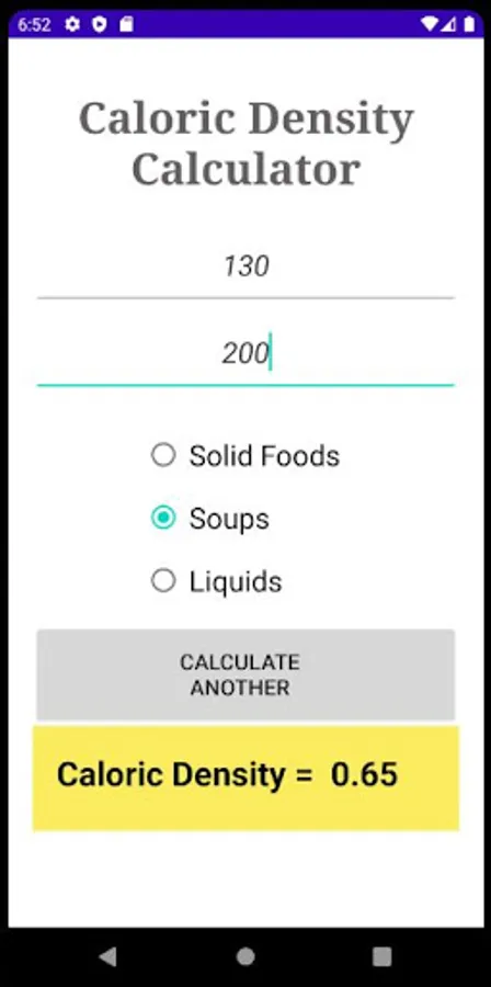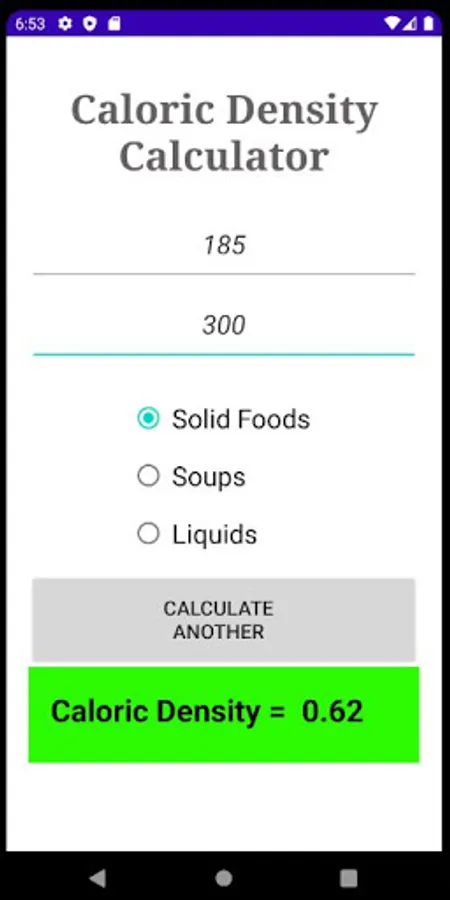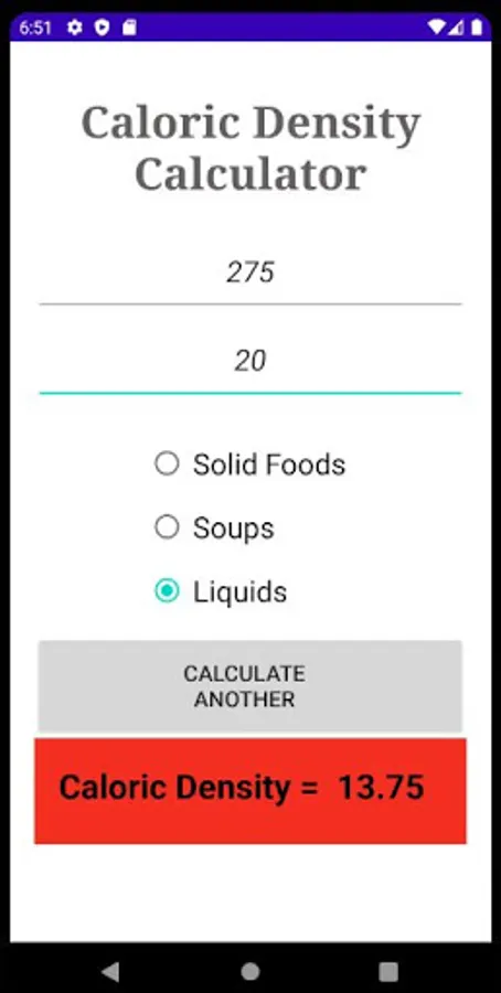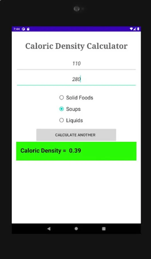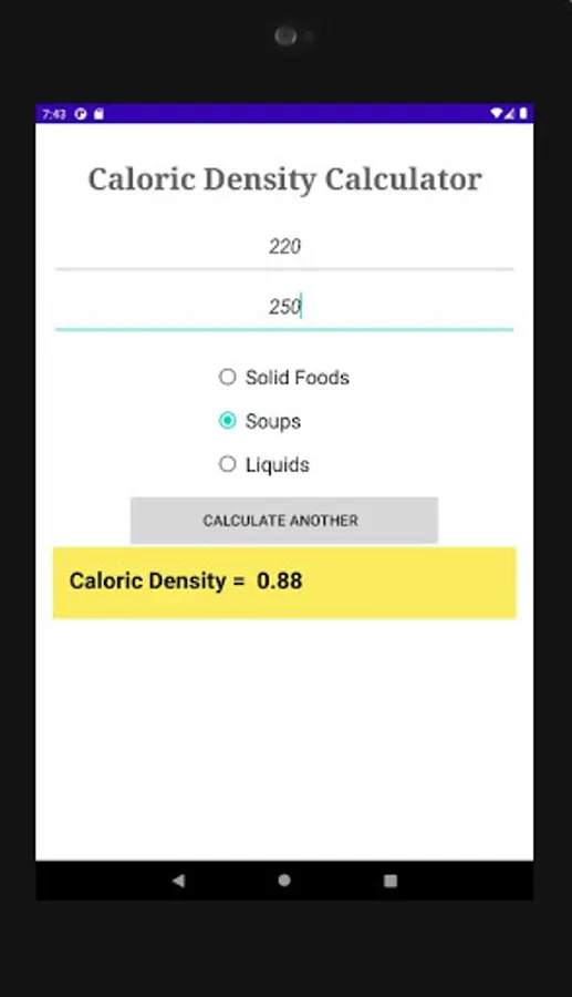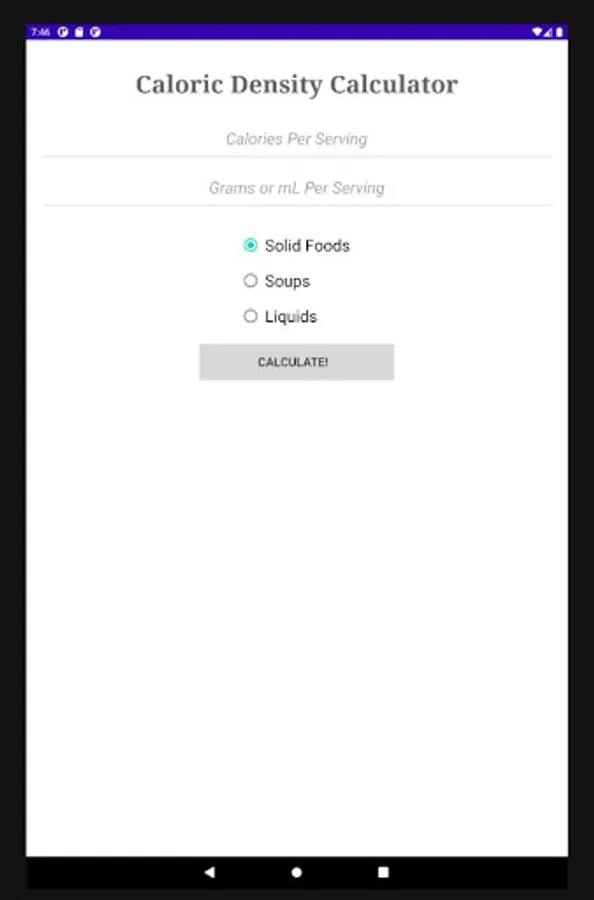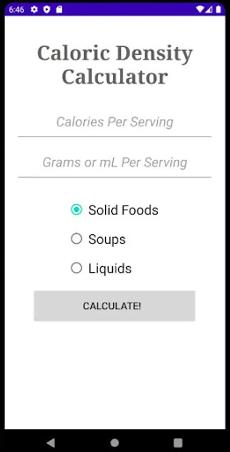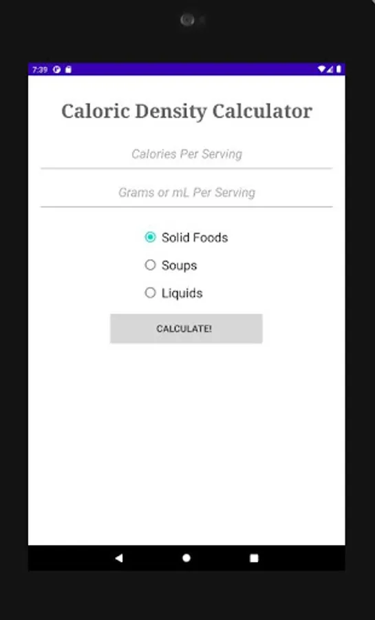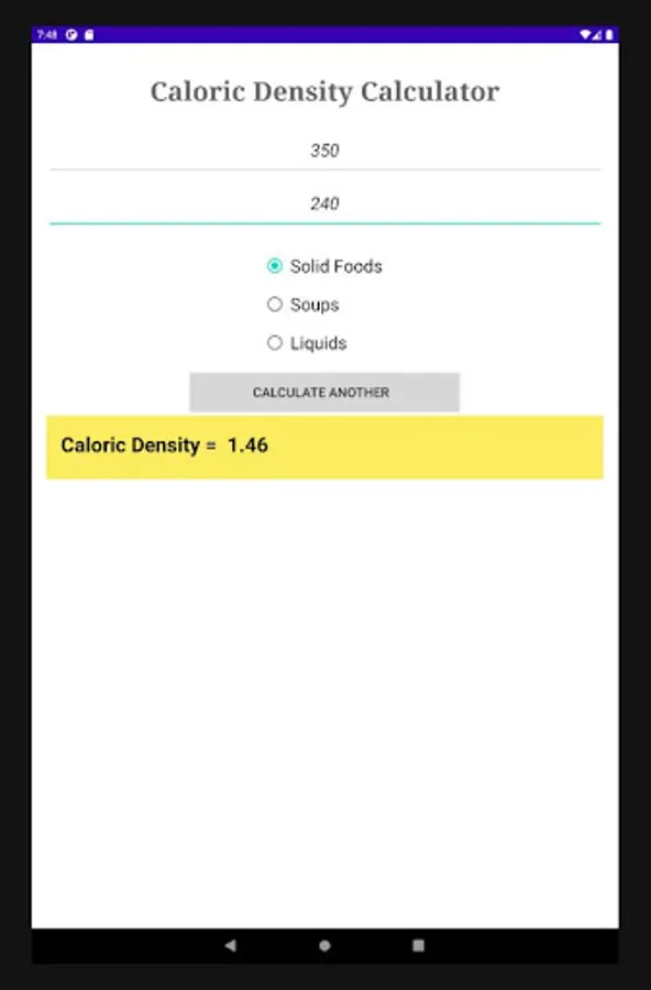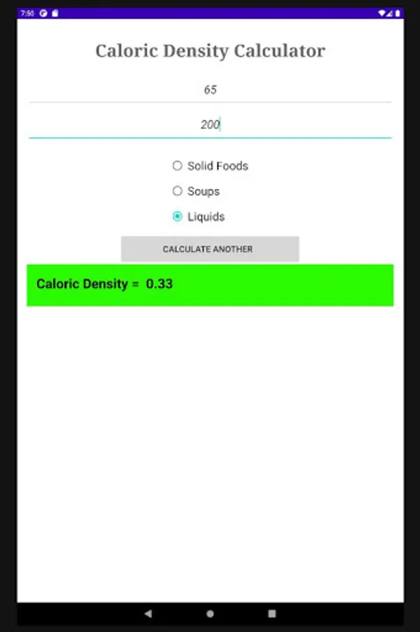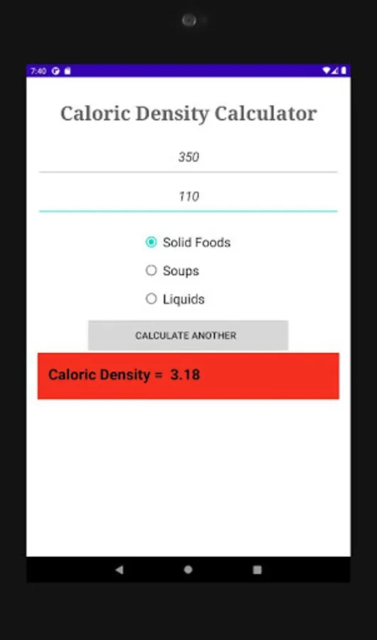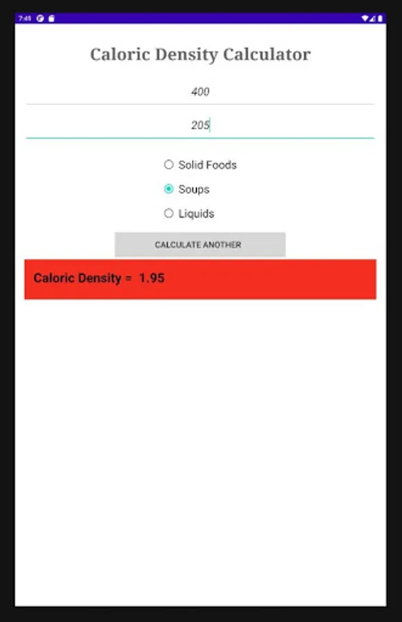 This caloric density calculator easily assists you in determining the caloric density of any food item as long as you have the calories per serving and the grams or mL per serving. It allows you to select the intake type, such as solid foods, soups and liquids.