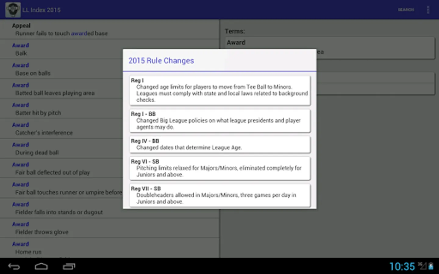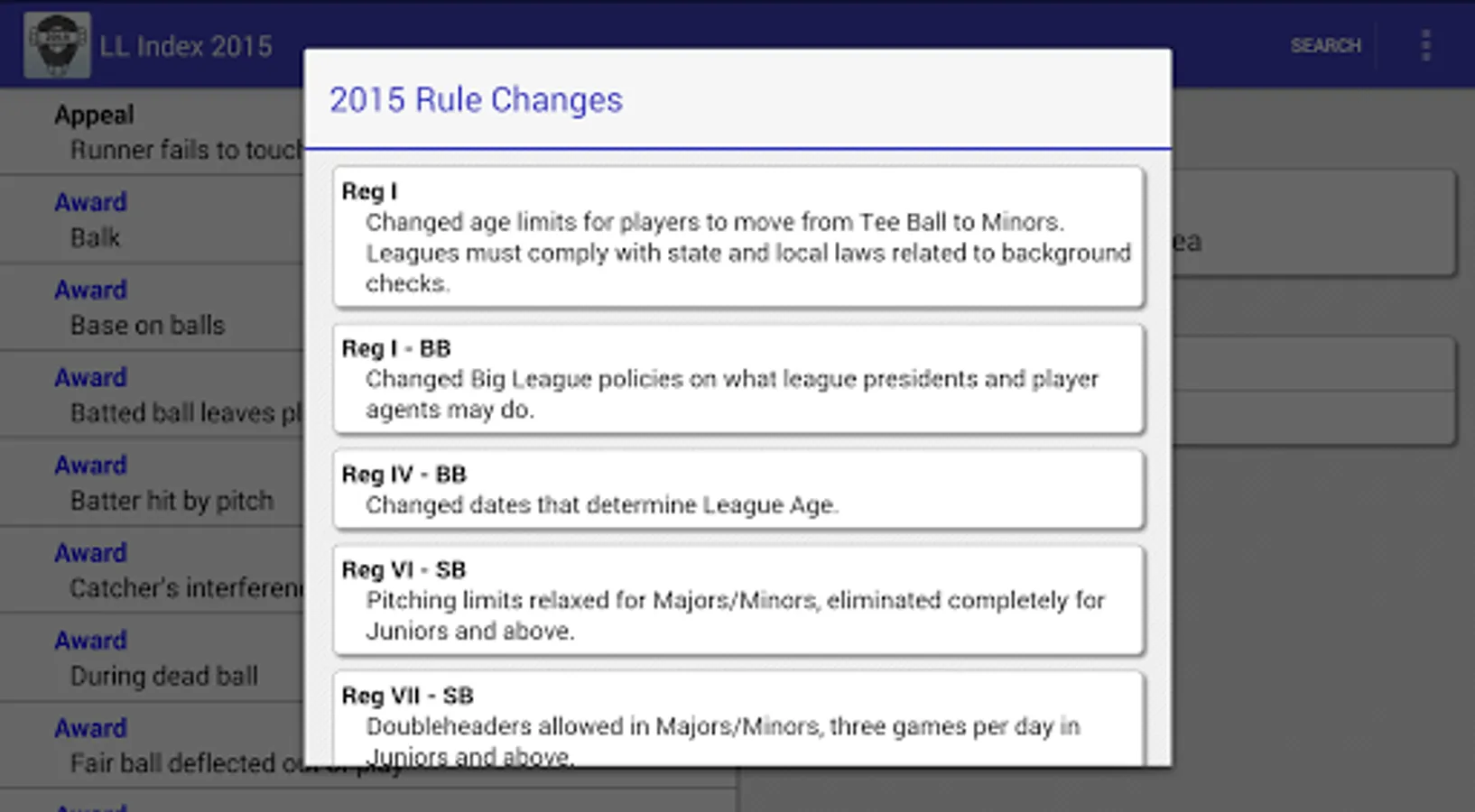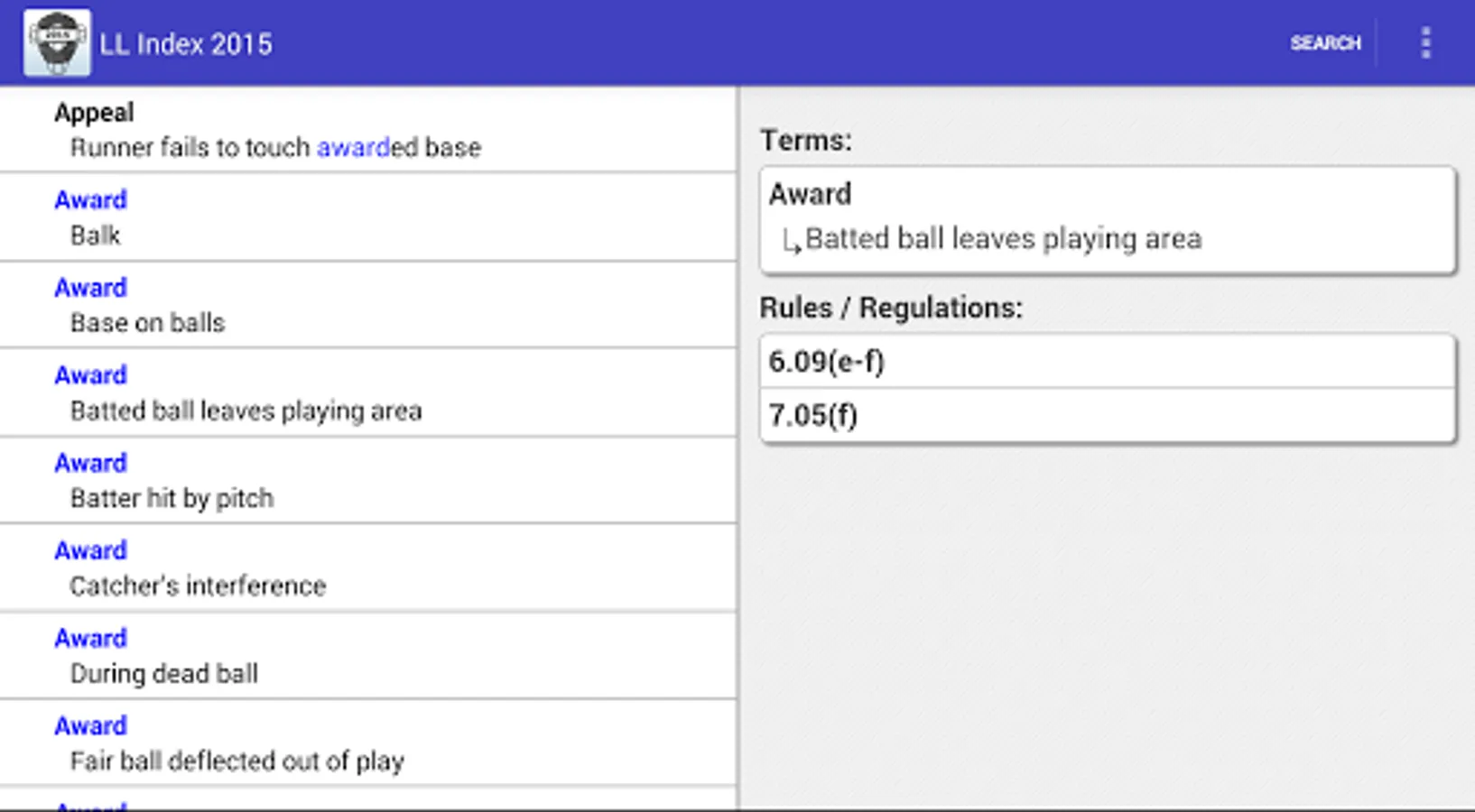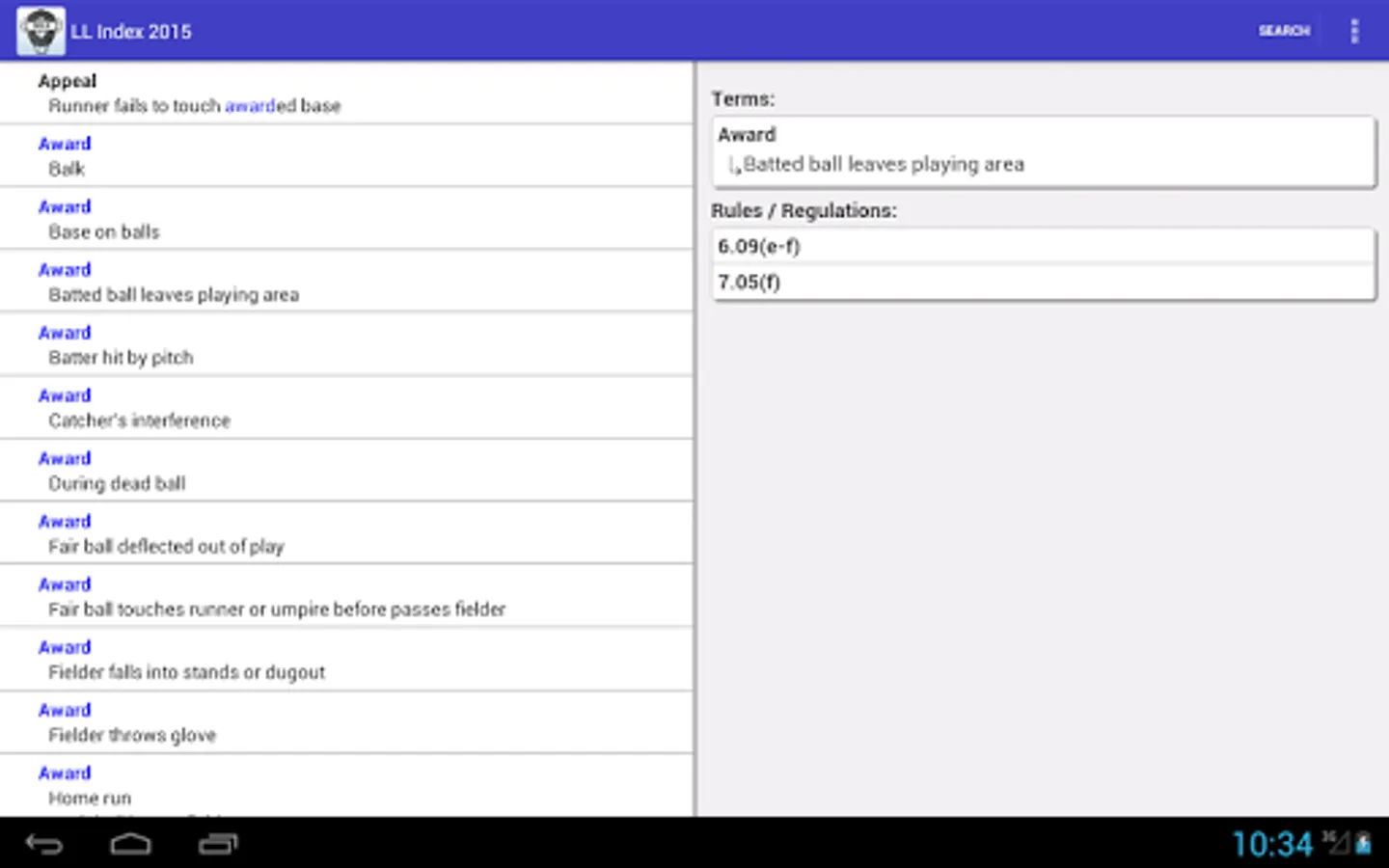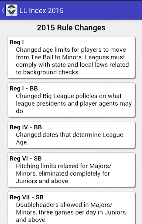 Since 2002, Kevin Hunter has published an index to the Little League rulebooks. This application is a mobile version of the 2015 printed index available through LLUmpires.com. Search the index by keyword or phrase, and obtain a list of the rule(s) and/or regulation(s) that pertain to that particular situation.