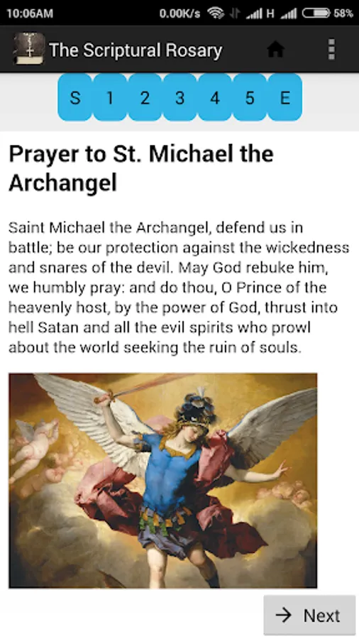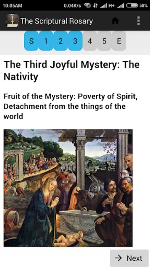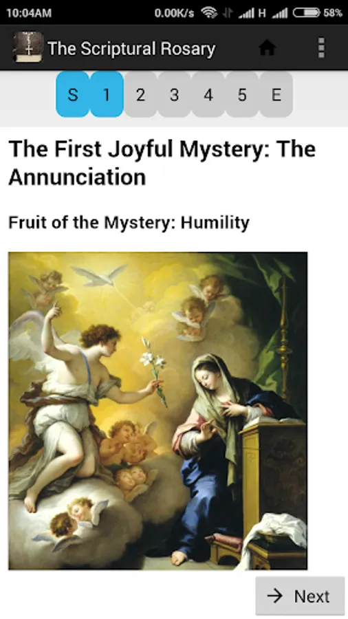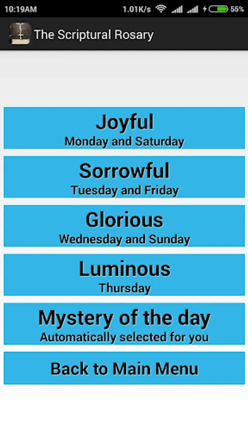 The application has an option to automatically selects the current mystery every day to read or you can manually select the Mystery you would like to pray.