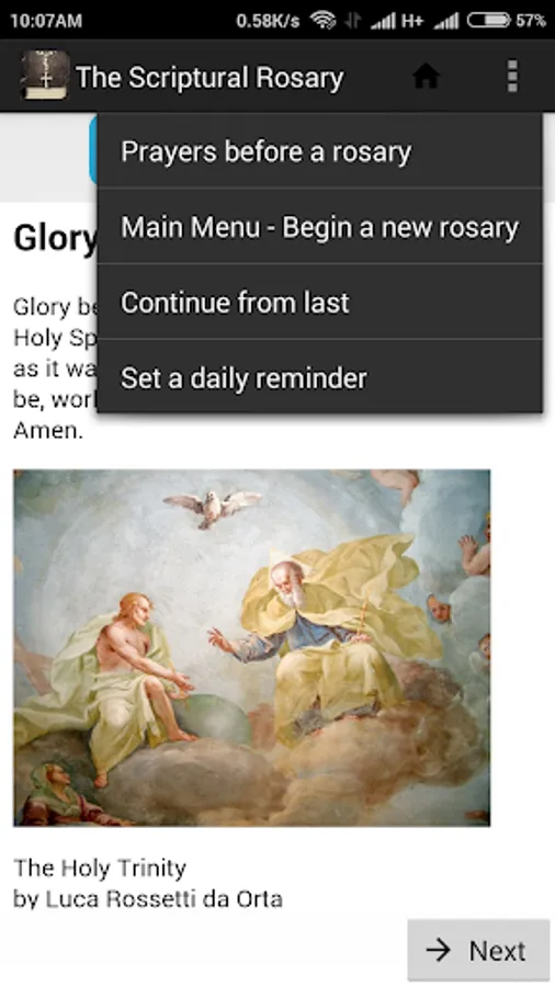 There is a "Prayers before a Rosary" and you can set a "Daily Reminder" for you to pray. If you like to continue reading and praying The Mysteries, you can go directly to the the 'continue from last reading' when you restarted the apps. In case you are Android phone re-booted when you are using the app, it will also go directly to the last read page.